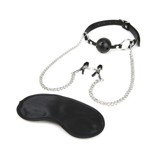 LUX FETISH BREATHABLE BALL GAG WITH ADJUSTABLE PRESSURE NIPPLE CLAMPS