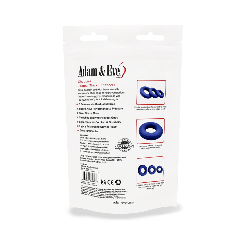 Turn Your Chubby Into A Steel Rod With 3 Extra-Thick Rings!Named for their extra-large size, the super stretchy Chubbies are just what your erection needs! The graduated rings are much thicker than your typical penis enhancer. That means a tighter squeeze to help you stay harder for longer and increase your girth too. Pick from 3 different sizes for a personalized fit or just wear them all for the max performance and pleasure boost. They''re extra soft for a comfortable fit and lightly textured to stay in position as things get slippery. Their enhanced durability ensures night after night of fun. Made from silicone. Inner size varies from 0.75 to 1.1 inches (unstretched). 3 extra-thick rings for increased erection enhancement Tighter fit helps maximize your hardness & girth Pick from 3 graduated sizes or wear them all at once Extra soft & super stretchy for comfortable wear Lightly textured to help stay in place Enhanced durability for long-term use Small is 1.5 by 0.4 inches with a 0.75-inch interior Medium is 1.9 by 0.5 inches with a 0.9-inch interior Large is 2.25 by 0.6 inches with a 1.1-inches interior Made from body-safe & stretchy silicone Compatible with water-based lubes only