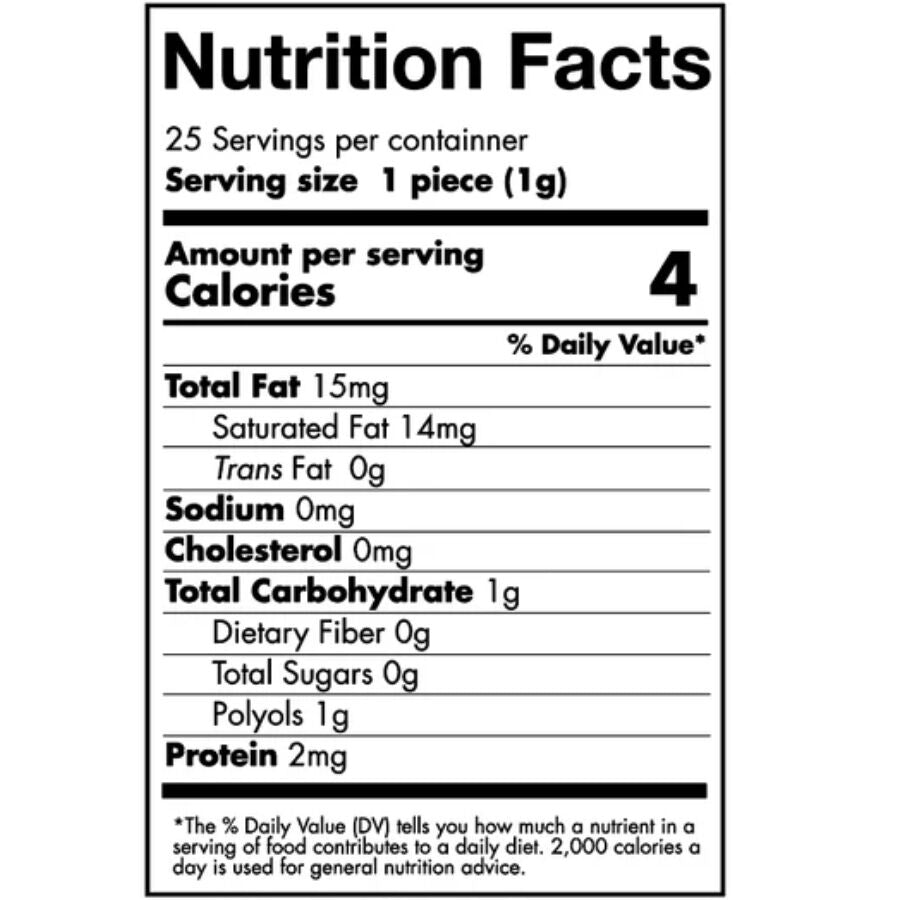 NUTRITIONAL DATA: Portion/Candy (1g). Energy per 100g: 1680kj/400kcal; fats 1.5g of which: saturated, 1.4g; carbohydrates, 97.2g of which: sugars, 0g; polyols, 97.2g; fiber 0.9g; proteins, 0.2g.