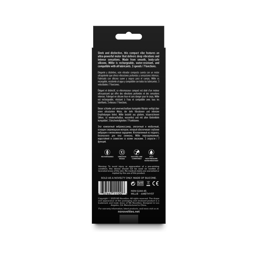 Sleek and distinctive, this compact vibe features an ultra-powerful motor that delivers deep vibrations and intense sensations. Made from smooth, body-safe silicone, Millie is rechargeable, water-resistant, and compatible with all lubricants. 3 speeds / 7 functions.Product Dimensions: 5.43 x 2.01 x 1.81 (Inches)Insertable Dimensions: 1.97 x 1.3 (Inches)Product Weight: 6.21 oz.Package Dimensions: 8.78 x 3.27 x 1.97 (Inches)Product Material: Silicone