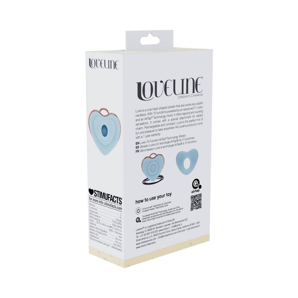 Luvie is a cute heart-shaped vibrator that also works as a stylish necklace. With 15 functions powered by an advanced F1 motor and an AirTap Technology motor, it offers tapping and sucking sensations. It comes with a special attachment for added charm. Rechargeable and compact, Luvie is the perfect mix of fun and pleasure to take anywhere! All Loveline products come with a 1 year warranty. Product dimensions: 2.56" x 2.36" x 1.3" Product weight: 2.12 oz Inner diameter: 0.51" Quantity motors: 2 Rotations per minute: 6500 RPM Rotations vibration tip: 11000 RPM Speed modes: 15 Multi speed: Yes Rechargeable: Yes Rechargeable time: 120 min Recharged battery lifetime: 150 min Waterproof: Yes Materials: ABS + Silicone