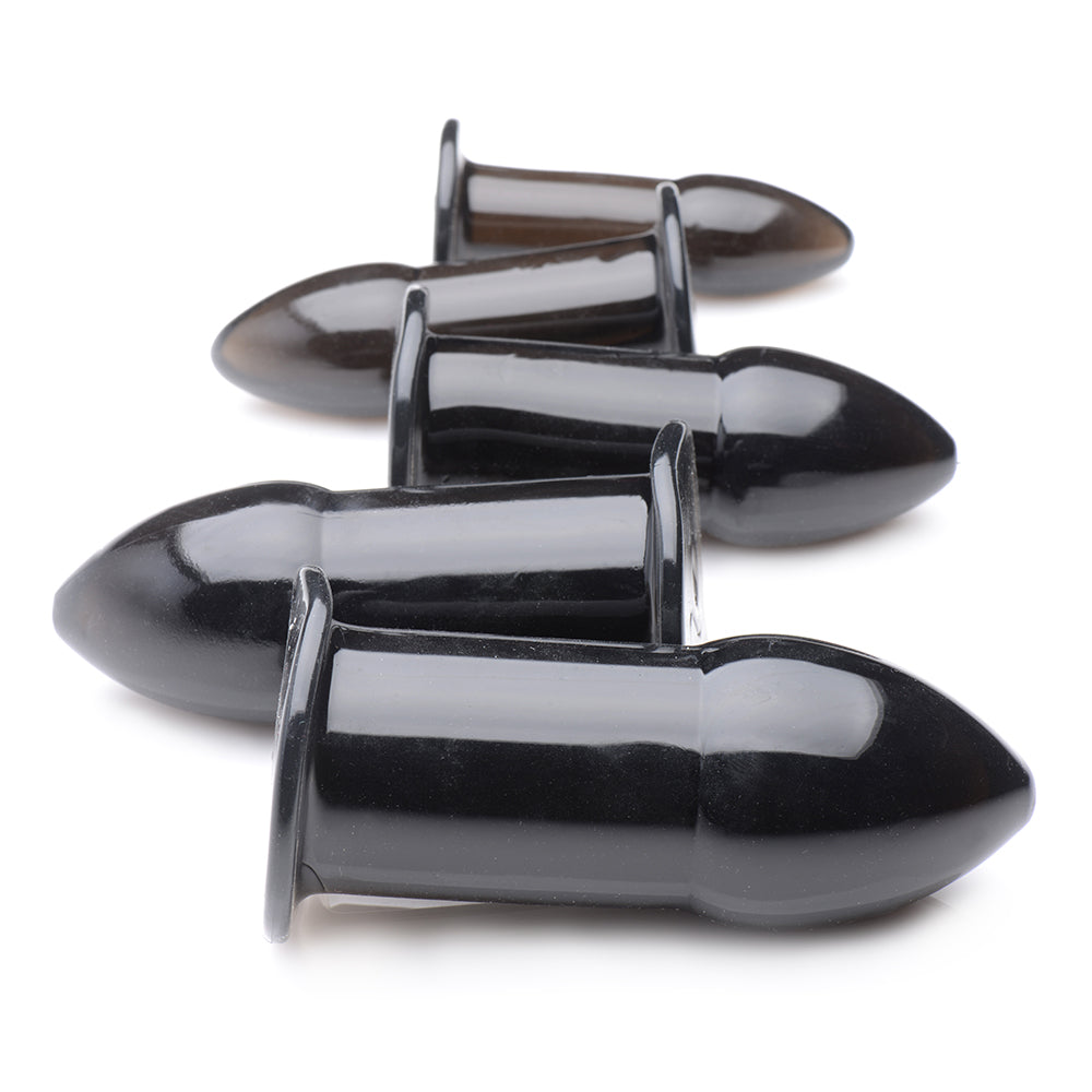 in.This rubber set of 5 gratifying and graduated sized anal dilators has everything you need for all sorts of anal play, whether you are new to backdoor toys or a seasoned connoisseur. Each tapered plug is shaped to be comfortably inserted, with a pointed end and flared base that will help keep everything in place for extended wear. The semi-rigid TPE provides the firmness needed for easy insertion, with enough flexibility for comfort. Use the plugs alone for pleasure, or use them as a tool to gradually step up your tolerance so you can take larger and larger toys. The graduated size allows you to work up to your desired size in ecstasy and ease. Measurements: From smallest to largest: 3.4 inches in length, 1 inch in diameter; 3.75 inches in length, 1.2 inches in diameter; 4.15 inches in length, 1.5 inches in diameter; 4.5 inches in length, 1.7 inches in diameter; 5 inches in length, 1.9 inches in diameter Material: TPE Color: Blackin.