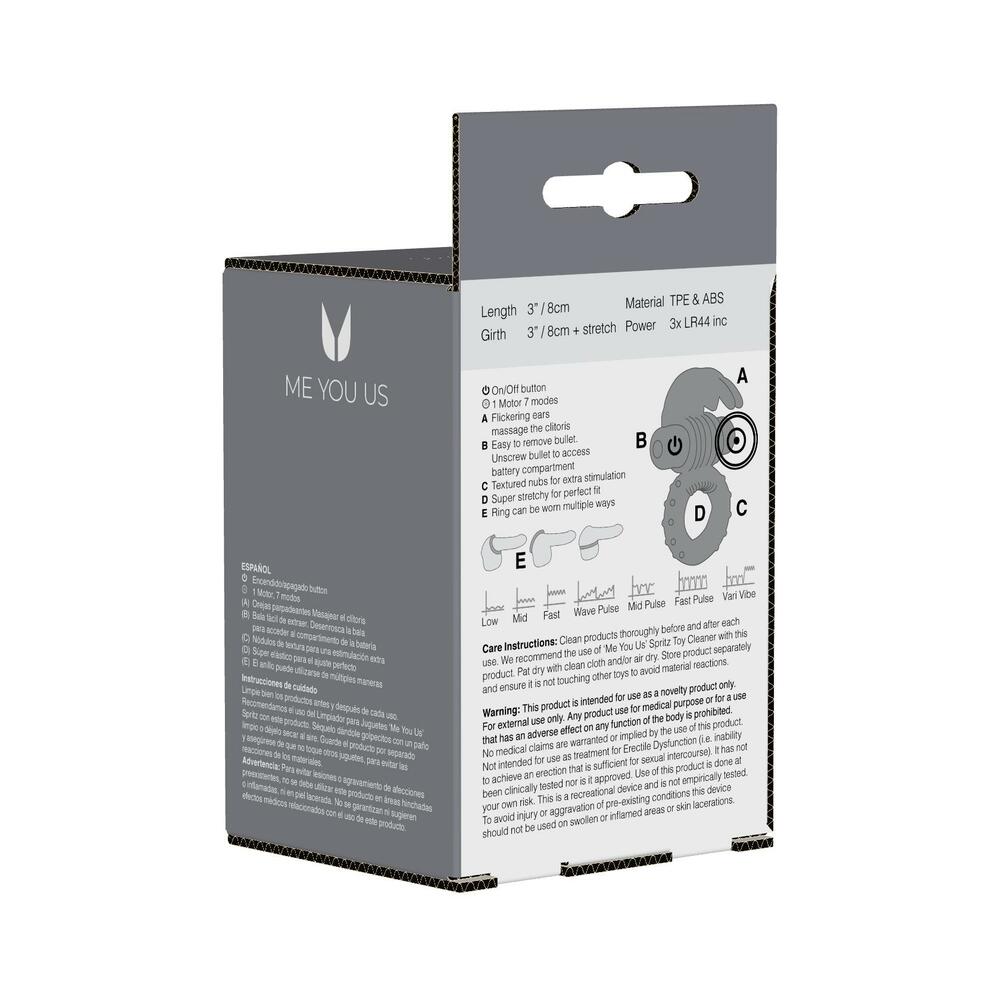 The Me You Us Hopping Hare vibrating cock ring is a cleverly designed toy that focuses on shared pleasure. This ring has a flexible clitoral stimulator that''s positioned to target her hot spots perfectly. The bullet adds intensity as you work your way through 7 stimulation modes. This cock ring is waterproof and is made from stretchy TPE and ABS. It measures 3.15 in. (8cm) and and features Low and High settings as well as Long Pulse, Short Pulse, Wave Pulse, and more! This vibrating cock ring is waterproof and free from phthalates and latex. It keeps him firmer for longer and intensifies his orgasm for an unforgettable climax. This ring is stretchy and easy to put on - and the comfortable design allows you to play for longer. This toy can be used with a water based lubricant and is easily cleaned when you''re done with play.