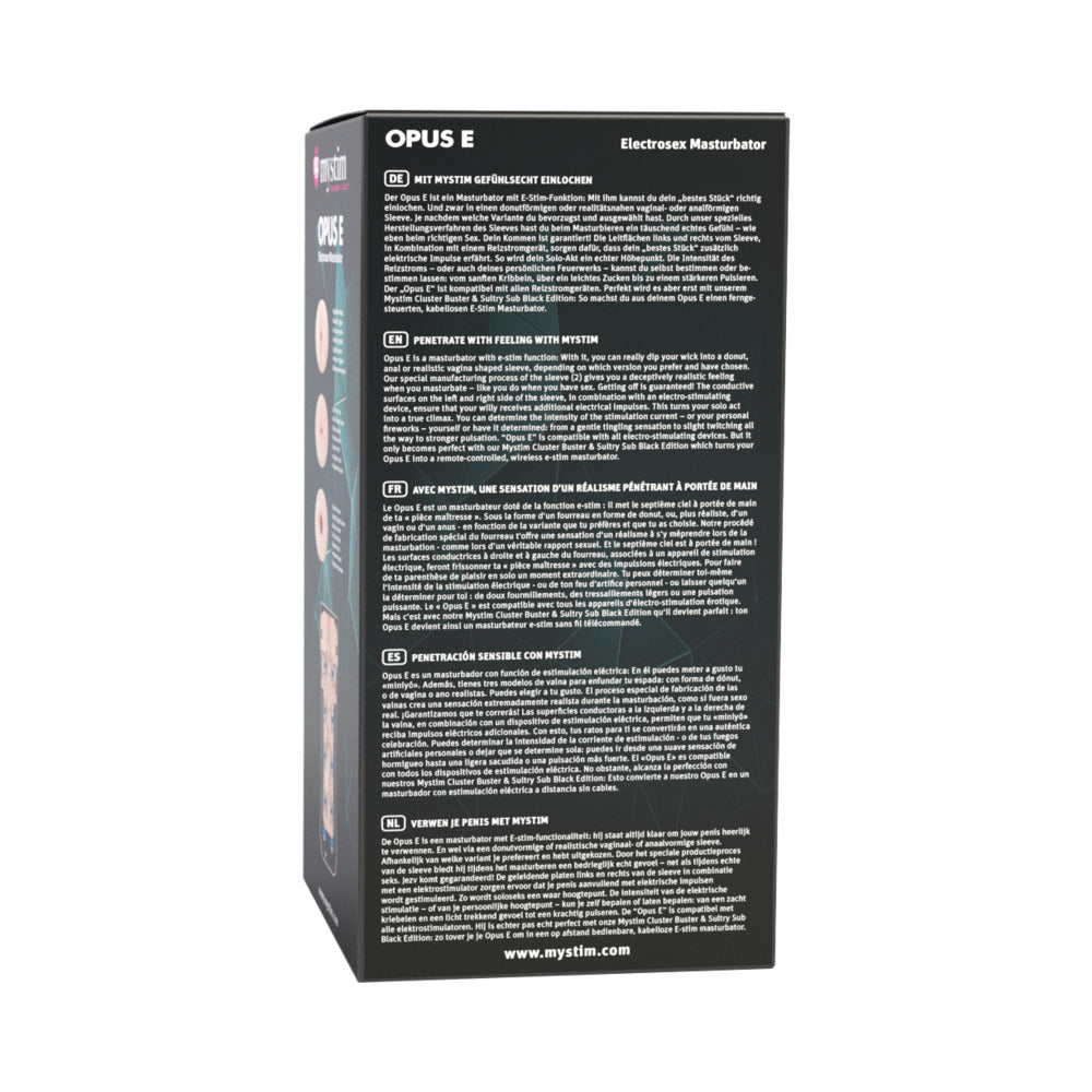 The Opus E combines e-stim and male masturbation with soft interior that transmits electrical currents from the base of the penis to the tip. A Masturbator with adapter cable to connect it to the E-stim devices TENSION LOVER or CLUSTER BUSTER. Also suitable for the wireless receiver SULTRY SUB. Can also be used without electrical stimulation. Anatomically neutral opening.IMPORTANT NOTE! Mystim Tension Lover Digital Nerv Stimulator or Mystim Cluster Buster Starter Kit is required for this item.