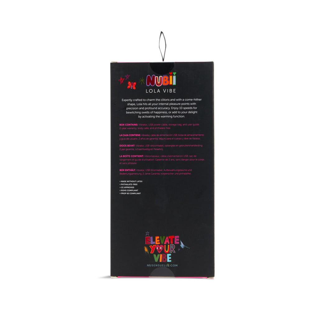 WITH A FLEXIBLE BODY AND GENTLE WARMING TO ENTICE ALL YOUR SENSES, LOLA DELIVERS MESMERIZING SWELLS OF DELIGHT 10 speeds Gentle warming Delicate ribbing Flexible body Designed for clitoral and G-spot stimulation Nubii motor Power level: 1 Motor sensation: buzzy + subtle gyration Rechargeable Water submersible Body-safe Meet Lola, expertly crafted to charm the clitoris and with a come-hither shape, Lola hits all your internal pleasure points with precision and profound accuracy. Powered by the Nubii motor, Lolaft.s ten speeds deliver buzzy and subtle gyration pulsations. The flexible shaft, delicate ribbing, and warming function tempt your senses further for an extraordinary experience providing unforgettable orgasms.Product Specifications MATERIAL: Body-safe silicone SIZE: 1.55 x 6.92 inches WEIGHT: .34 lbs SPEEDS: 10 CHARGE TYPE: Magnetic USB charging port CHARGING TIME: Fully charged within approximately 2 hours USER TIME: 60 minutes INTERFACE: 1-button WARRANTY: 2 years