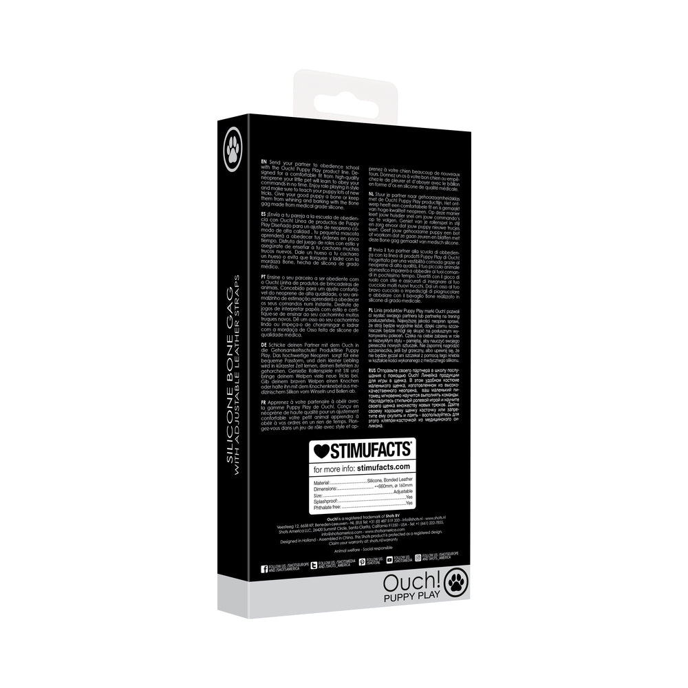 Send your partner to obedience school with the Ouch! Puppy Play product line. Designed for a comfortable fit from high-quality neoprene your little pet will learn to obey your commands in no time. Enjoy role-playing in style and make sure to teach your puppy lots of new tricks. Give your good puppy a bone or keep them from whining and barking with the Bone gag made from medical-grade silicone. Dimensions package 3.54in. x 0.98in. x 6.69in. Weight package 4.3 oz Product dimensions 24.61in. x 1.73in. x 0.79in. Product weight 3.39 oz Splashproof Yes Phthalate free Yes Materials Silicone, Bonded Leather