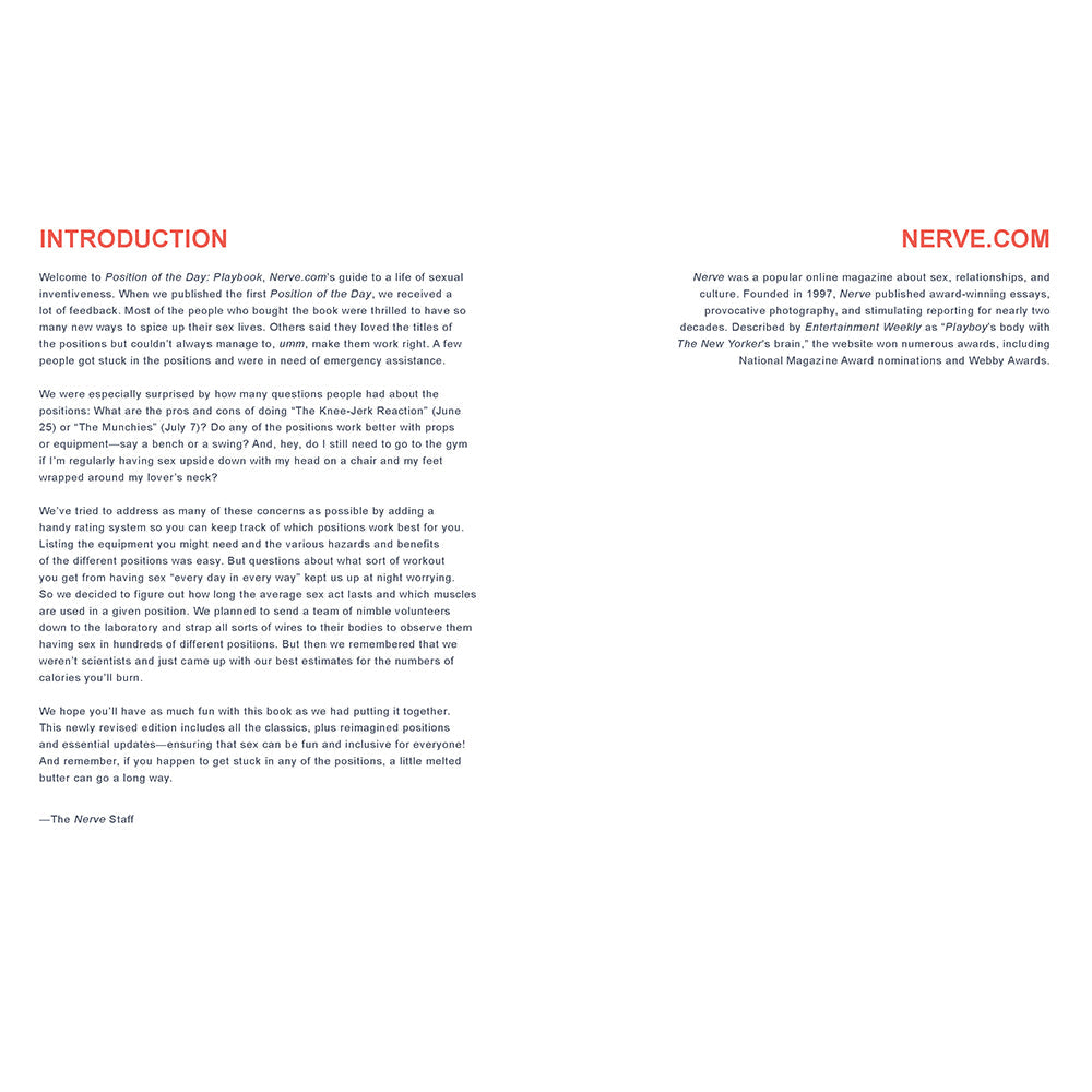 Position of the Day Playbook Revised and UpdatedSex Every Day in Every WayBy Nerve.comPaperback; 376 pages Limber up! This completely revised and updated edition of the bestselling Position of the Day Playbook (over 750,000 copies sold) includes 365 mind- (and body-) bending sexual positions for every day of the year.Following the publication of the wildly successful Position of the Day book, the creators at Nerve were bombarded with reader comments: Do any of the positions work better with equipment? And, hey, do I still need to go to the gym if I''m regularly having sex upside down with my head on a chair and my feet wrapped around my lover''s neck? With this new edition of the companion Position of the Day Playbook, they have tried to address these concerns and others with inspiringly sexy and hilariously informative guidance.For each position in this book, you get: An estimated caloric expenditure (for each person involved) A humorous list of possible side effects (leg cramp, rug burn) Equipment recommendations (rocking chair, ottoman) Plenty of space to rate and review your experience Featuring all the classics from the original playbook, as well as reimagined positions, new pop culture references, and essential updates throughout, this edition ensures sex can be fun and inclusive for everyone.TRUSTED RESOURCE: With over 1.7 million copies sold in the book series (Position of the Day and Position of the Day Playbook), Position of the Day is the go-to resource for all things fun and sexy.FRESH UPDATE ON A TRIED-AND-TRUE CLASSIC: Featuring 365 sex positions of varying degrees of difficulty, and a layer of data and details to add some sex-positive planning into the action, there''s something for every lover here. Beginners will enjoy trying out positions like the Spoon Drawer and the Sexy Pretzel, while the more adventurous will have fun with the Hip Huggers, the Hot Slide, and many more.INCLUSIVE IMAGES: The sex book for everyone! Perfect for folks of all sexual orientations and gender identities looking for a fun and tasteful book of sex positions.FUN AND SAUCY GIFT: A great present or self-purchase for Valentine''s Day, anniversaries, bachelor or bachelorette parties, or anytime gift to turn up the heat. Pair with the companion Position of the Day book, massage oil, or a sex toy to create a delightfully playful package.EASILY PORTABLE: This pocket guide is the perfect size to keep on your bedside table (or coffee table for some fun conversation starters) or to throw in your bag or luggage for a romantic getaway or vacation.Publisher''s note: Should parties find themselves stuck in one of the positions, they are advised to contact 911 immediately and neither Chronicle Books nor Nerve directly.Perfect for: Couples and romantic partners of all orientations looking to have fun together Fans of the Position of the Day series Anyone seeking to spice things up in the bedroom Gift givers looking for something special for a bachelorx party, Valentine''s Day, or anniversary Shoppers seeking a white elephant present, gag gift, or unique way to make someone laugh
