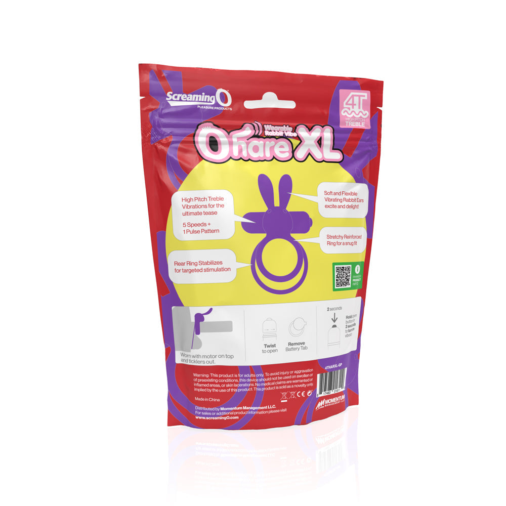Hop on Screaming Oft.s 4T Ohare XL! It is sure to turn whatever shaft you are wearing it on into your favorite rabbit vibe. The body-safe, True Silicone® double rings are larger and have more stretch for a reinforced yet comfortable fit. The rear ring stabilizes, providing targeted stimulation while the soft, flexible rabbit ears effectively transfer the treble style vibrations, assuring to excite and delight.Screaming O 4T Ohare XL is manufactured using materials and processes that are both ethical and sustainable. Because in addition to promoting sexual health and wellbeing, Screaming O strongly believes in leaving this planet better off than we found it. For example, the 4T packaging is compostable, eco-friendly packaging made from a combination of recyclable Kraft paper and biodegradable & compostable PLA.Additionally, new 4LR44 batteries are being implemented for the bullets. Not only are these batteries more reliable and longer lasting for your pleasure, but they are also child-safe and require fewer units to power the products therefore adding less waste to the landfills.Features: 4T motor with tickle and tease, treble vibrations Made of 100% body-safe True Silicone® and ABS materials 5 speeds plus 1 pulse pattern Soft and flexible rabbit ears transfer vibration 30+ minutes of battery life New reliable and long-lasting 4LR44 battery Waterproof 5 speeds plus 1 pulse pattern