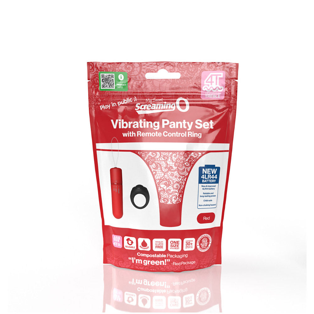 My Secret Screaming O 4T Panty Vibe puts the power of pleasure at your fingertips with a powerful 4T treble style tickle and tease vibrating bullet that fits discreetly into a side-tie lace panty to keep it in place.Simply slip the bullet into the pantyft.s small pocket and enjoy powerful stimulation directly on the sweet spot. This sexy and subtle mini vibe allows you play in public with a clever remote control disguised as an ordinary finger ring and works up to 50 feet away! The vibe is in.monogamousin. meaning it can only speak to one remote at a time. This way, you always know who is turning you on!The remote control makes it easy to shuffle through 10 different vibration functions that tease, please and titillate with the touch of a button. Watch as it induces squirming and quivering from across the room. Covert enough to wear under clothing while out on the town, this audacious sex toy lets couples experiment with public pleasure and spice up date night, adding a secret twist. Choose from four fashion-forward color schemes, perfect for any special occasion and make it a night to remember!Features 10 FUNction 4T motor with treble style tickle and tease vibrations Discrete remote control disguised as an ordinary finger ring Works from up to 50 feet away Side-tie panty fits up to 60-inch waists 100% Waterproof 30+ minutes of battery life New reliable and long-lasting 4LR44 battery