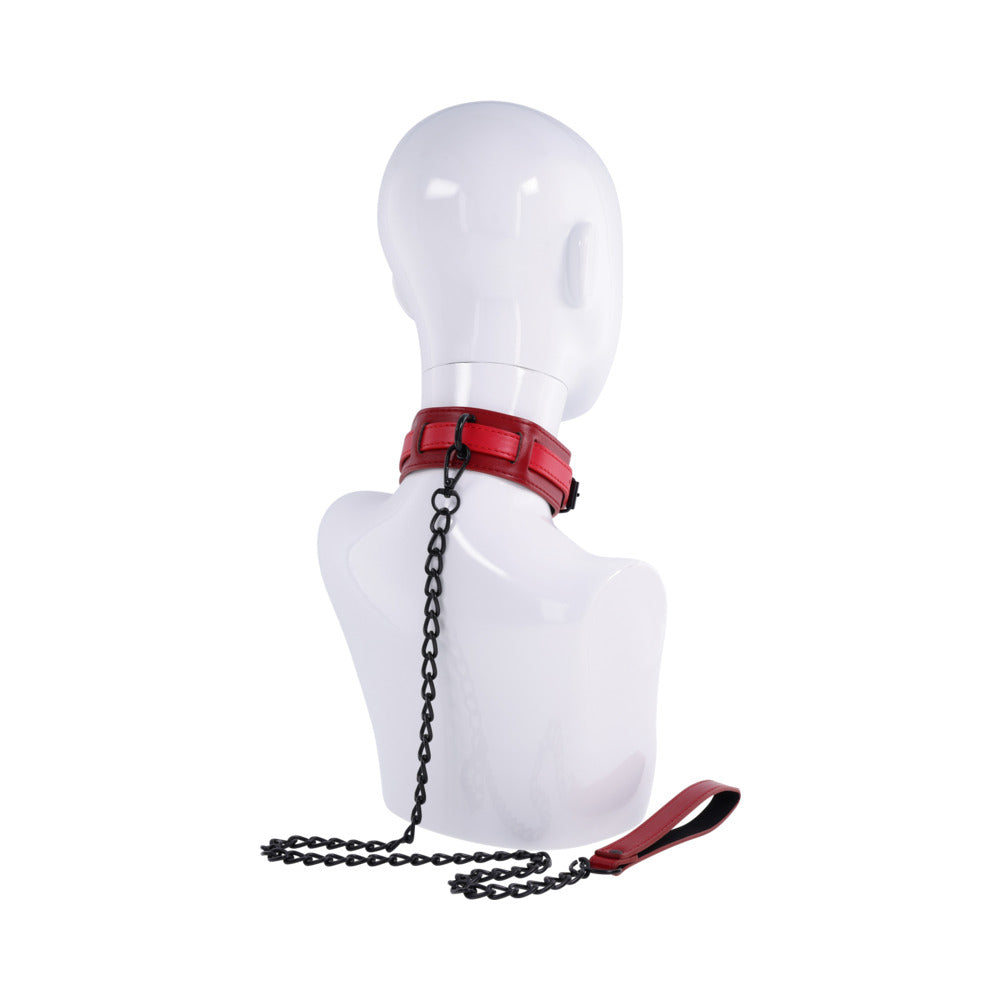 Take control in style with the Ex''s & Oh''s Collar and Leash. This striking set features a bold, deep red faux leather collar paired with a sturdy matte black chain leash for a look that''s as commanding as it is stylish. The adjustable collar ensures a comfortable fit, while the leash''s wrist loop keeps everything within reach. Whether you''re exploring dominance and submission or simply adding a touch of flair to your play, this collar and leash set is the perfect addition. Fits necks up to 16" with 30" leash Adjustable faux leather collar ensures a comfortable fit and stylish control Matte black chain leash with wrist loop provides secure handling and easy accessibility Materials: 85% PU, 10% Iron Alloy, 5% Zinc Alloy