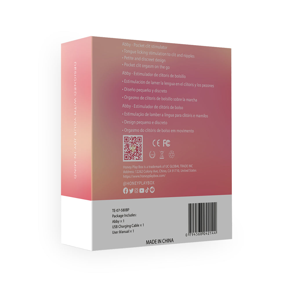Prepare for Limitless PleasureAre you searching for a toy that will lick and flick you until youft.re quivering in pleasure? This oral-inspired vibrator has a small tongue that flicks to mimic oral stimulation and deliver thrilling sensations. Itft.s ideal for clitoral or external stimulation.Mini Clit Licking Pocket Tongue Sex ToyNever has a sex toy been so petite, so pretty, and so practical! No one can resist the attractiveness of this little beauty. This tiny clit sucker is aesthetically pleasing and functional satisfying to all your senses, featuring a minimalistic design yet with no compromise on functionality. With a discreet look, Abby is the one you want to pick to go with you on any erotic journeys.Rock Your Hot Spots for the Ultimate BlissAbby has a desirable licking tongue flutters energetically against any of your erogenous spots. Use it to lick the clit or nipples, or add it in foreplay to ignite the sparks. With 9 different licking patterns, your clit play and nipple tease will get you as crazy as you have been eagerly desiring. You will be turned on in minutes and want more and further.Enjoy Orgasms On the MoveThanks to its small body and discreet look, you can always take this clit licker in your pocket or your purse and be ready to enjoy its pleasing qualities anytime you feel in the mood. The transparent cap addresses aesthetics and ensures discreetness.Enjoy Orgasms On the MoveThanks to its small body and discreet look, you can always take this clit licker in your pocket or your purse and be ready to enjoy its pleasing qualities anytime you feel in the mood. The transparent cap addresses aesthetics and ensures discreetness.Product Specifications: Material: ABS, Silicone Size: 2.27in. x 1.57in. x 1.26in. Net Weight: 0.13LB Battery Type: Li-ion Rechargeable Charging Time: 1.5 Hours Using Time: 1.2-1.8 Hours Noise Level: