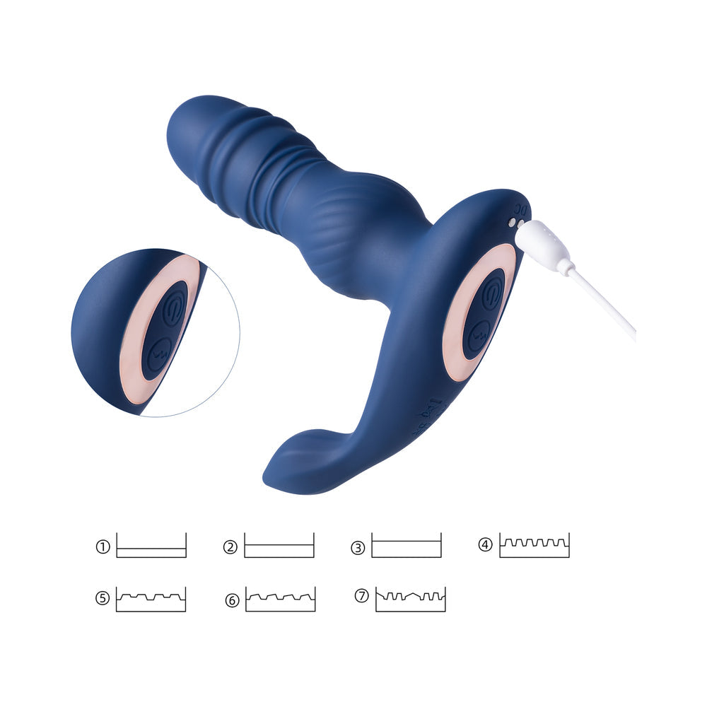 Dig into VersatilityJADEN''s artistic and sleek design in royal blue is both visually and physically pleasing. This thrusting prostate massager features a bulbous head for deep stimulation, a contoured perineum stroker, and a flower-bud scrotum tickler. Join JADEN and experience unparalleled orgasms.Impulsive Thrusting Intense VibratingUpgrade Your Backdoor Play with JADEN, the wild thrusting and vibrating anal stimulator If you''re looking to spice up your backdoor play, JADEN promises to deliver triple erotic bliss. This wild thrusting and vibrating anal stimulator flirts with your P-spot, tantalizes your sensitive perineum, and teases your delicate scrotum. Chase the orgasmic buildup and push your pleasure to the max with JADEN. 3 in 1 thrusting anal toy: Designed with versatile functions, this butt plug is dedicated to delivering pleasure to your backdoor, sensitive perineum, and scrotum. Kick your pleasure up a notch with triple stimulation. Thrusting rounded end: Designed with men''s anatomy in mind, this anal plug is easy to insert and targets the P-spot smoothly. Take JADEN as your best anal partner and enjoy a new level of pleasure. Contoured base and angled bud: There''s no need to worry about the butt plug falling out. The contoured base of this anal sex toy ensures that it stays in place and performs well inside. The base also vibrates to massage the perineum, while the flower-bud tickles the scrotum. Remote control joy: This prostate stimulator comes with an elegant ring-like remote control. Whether in solo play or couple play, this toy will make you feel heavenly euphoria. Indulge in steamy pleasure with JADEN. Body-safe material and waterproof: Made of superior materials, this anal butt plug is smooth and safe to wear. Its waterproof design allows you to enjoy blissful pleasure in water play. Release Your Anal Fantasies!Looking for some steamy anal pleasure or craving a P-spot thrill? JADEN is ready to shake things up and give you a happy ending. This vibrating butt plug sex toy triggers your backend nerves, tantalizes your perineum, and stimulates your scrotum, leaving you craving more. Take JADEN and experience the ultimate fun. Material: ABS+Silicone Battery Type: 650MAh Rechargeable: USB Rechargeable Vibrating Modes: 7 Vibrating and Thrusting Modes Noise Index: 60DB Charging Time: 100 Mins Work Time: 50 Mins Weight: 0.40LB Waterproof: IPX7