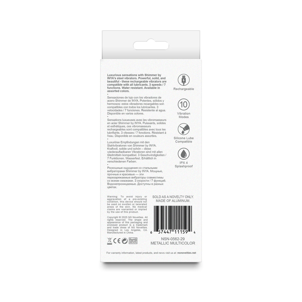 Luxurious sensations with Shimmer by INYA''s steel vibrators. Powerful, solid, and beautiful – these rechargeable vibrators are compatible with all lubricants. 3 speeds / 7 functions. Water resistant.Product Dimensions: 4.76 x 1.46 x 1.46 (Inches)Insertable Dimensions: 4.76 x 1.46 (Inches)Package Dimensions: 7.87 x 3.46 x 1.85 (Inches)Product Material: Aluminum Alloy