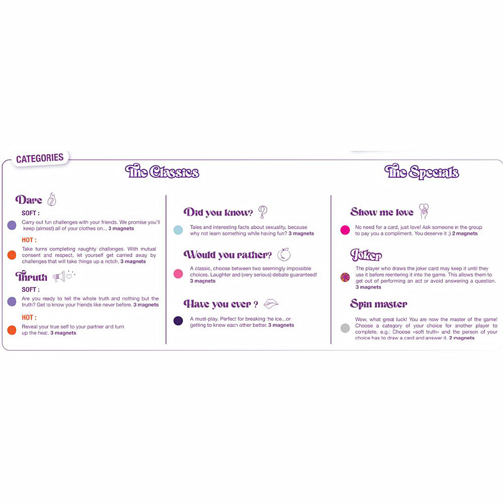 Discover Spin me ''Round, a roulette game that will spice up evenings with your friends or partner and reveal your most intimate secrets. Let your imagination get loose, be ready for some fun and learn one sex fact or two along the way! Here, everything is permitted with respect and consent, always. Spin the wheel and just enjoy some fun without any winner or loser.The roulette wheel holds 14 magnets. The magnets represent the game''s different categories, of which there are 10 in all. Build your roulette wheel to suit your moods and desires with the categories that interest you.INSTRUCTIONS:Once you''ve selected the categories and positioned the magnets on the wheel, simply spin the arrow, draw a card (or not depending on the category), and perform the action corresponding to that section.Included in the game: A drawer box A roulette wheel A blindfold 355 playing cards 28 magnets