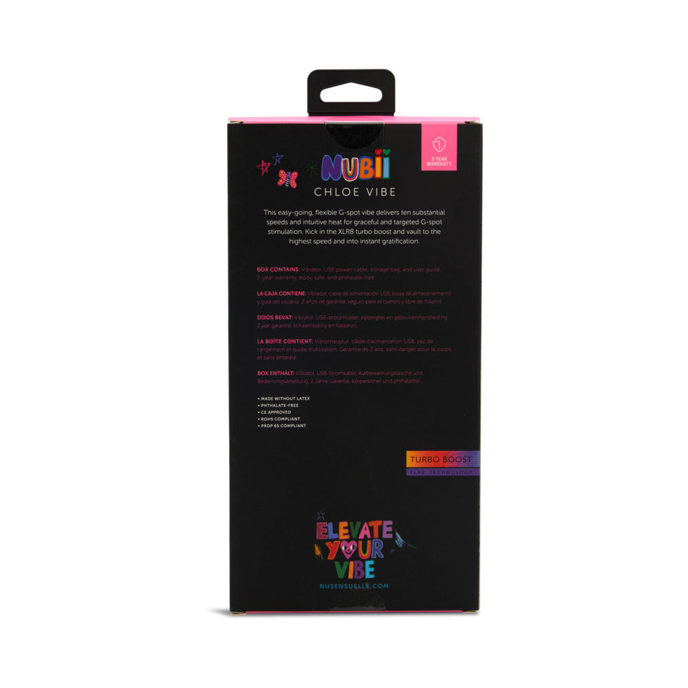 MANY PRODUCTS IN THE MARKET CATER TO EXPERIENCED USERS, with product size reinforcing this perception. If you are new to pleasure, size can always be daunting, so we created the easy-going and welcoming Chloe. This sleek and exceptionally pliable vibe features ten significant speeds, enhanced by its automatic heat and XLR8 turbo boost functionality. Chloe''s adaptability extends beyond pinpoint G-spot accuracy – angle it above the clitoris or nipples during partnered play and surrender to waves of pleasure. Like the gentle stroke of a lover''s caress, Chloe''s agile figure delivers thoughtful yet profound delight.GENTLE WARMINGHeat will automatically turn on with the product. It will take up to 5 minutes to feel maximum warmth. The temperature will be around 105°F. As the motor runs, heat will remain at this temperature.XLR8 TURBO BOOSTAccelerates speed to highest intensity for 12 seconds. 10 Speeds Flexible Nubii Motor 100% Body-safe Silicone USB-Rechargeable Water Submersible Includes Satin Carrying Pouch Technical Specs MATERIAL: Silicone SIZE: 1.44 x 7.28 inches WEIGHT: .14lbs CHARGE TYPE: Pinpoint USB CHARGING TIME: 1 hour USER TIME: 1-1.5 hours NUMBER OF SPEEDS: 10 INTERFACE: 1-Button