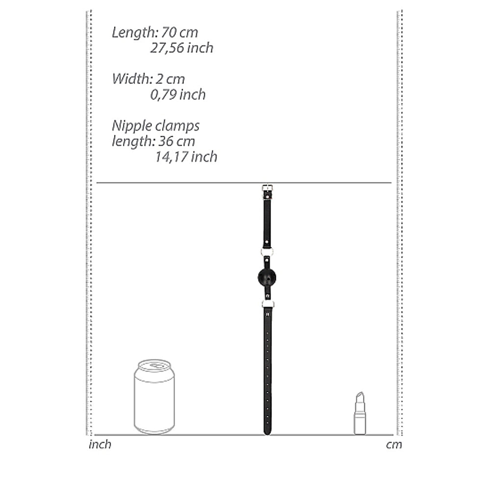 If you want to reach a higher level in your sex life and make it more extreme, you have to try this Black & White Collection Ball Gag with Nipple Clamps! With the adjustable clamps you can tease or dominate your partner totally. The ball gag strap is made from leather and very comfortable to wear. Because of the adjustable leather straps you can adjust your collar to every size you prefer. Dimensions package 6.69in. x 3.54in. x 1.97in. Weight package 5.57 oz Product weight 4.69 oz Specifications Nipple clamp chain: 30 cm Materials Leather, ABS, Metal