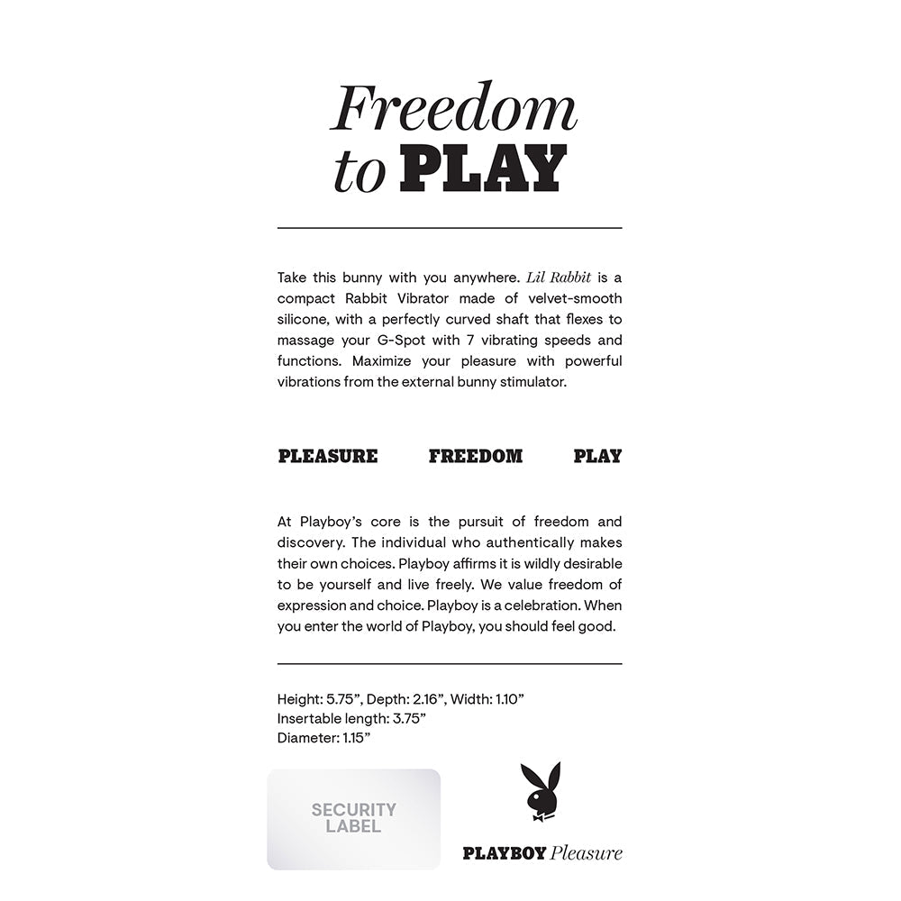 Take this bunny with you anywhere. Lil Rabbit is a compact Rabbit Vibrator made of velvet-smooth silicone, with a perfectly curved shaft that flexes to massage your G-Spot with 7 vibrating speeds and functions. Maximize your pleasure with powerful vibrations from the external bunny stimulator. 2 powerful motors controlled together 7 vibration speeds & rhythms Body-safe Silicone Phthalate & latex free Waterproof & submersible Rechargeable, USB cable included 5 year Warranty Dimensions: Height: 5.75in., Depth: 2.16in., Width: 1.10in.