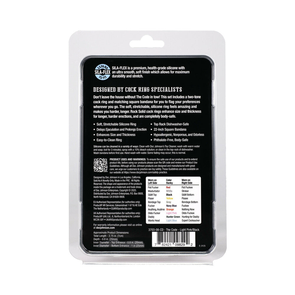 Don''t leave the house without The Code in tow! This set includes a two-tone cock ring and matching square bandana for you to flag your preferences wherever you go. The soft, stretchable, silicone ring feels amazing and makes you harder, longer. Rock Solid cock rings enhance size and thickness for longer, harder erections, and are completely body-safe. Soft, Stretchable Silicone Ring Delays Ejaculation and Prolongs Erection Enhances Size and Thickness Easy-to-Clean Ring; Top Rack Dishwasher-Safe 22-Inch Square Bandana Hypoallergenic, Nonporous, and Odorless Phthalate-Free, Body-Safe CockringTotal Length: 2.75 in. (7cm)Width/Diameter: 2 in. (5.1cm)Depth: 0.8 in. (20mm)Bandana (Hanky)Total Length: 22 in. (55.9 cm)Width/Diameter: 22 in. (55.9 cm)