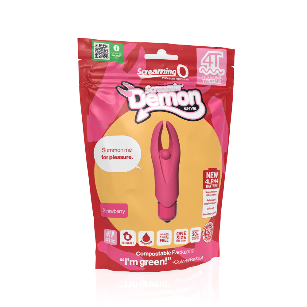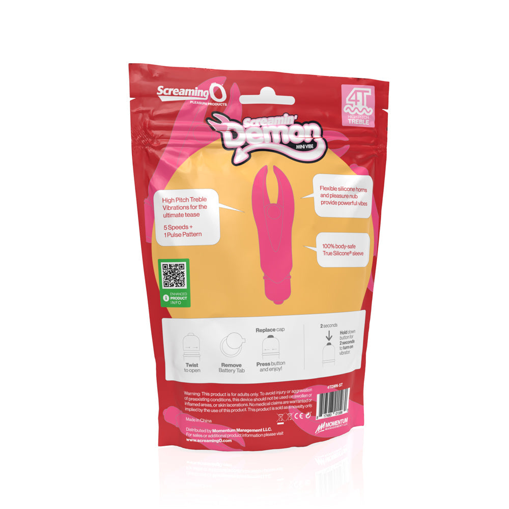 The 4T Demon mini vibe is a clever and compact mini vibe with flexible in.hornsin. that transfer tickle and tease vibrations all the way to their tips for targeted and devilishly intense sensations. Its 5-speed motor features a bonus pulsation mode and makes it easy to unleash your inner nymph while exploring and discovering your favorite kind of intimate mischief. And for fans of direct clitoral stimulation, the 4T Demon boasts a firm pleasure bead right between its horns to transfer extremely strong vibration right where you want it. The 4T Demon is the perfect clitoral vibe for those who like lots of power packed into a compact shape. Tickle and tease the nipples and other sensitive zones for flirty foreplay or use it to help orgasms come faster and easier solo or with a partner. Itft.s a portable and affordable sex toy for users of all experience levels and can even be used under water to turn an ordinary shower or bath into a wickedly satisfying experience!Screaming O 4T Demon is manufactured using materials and processes that are both ethical and sustainable. Because in addition to promoting sexual health and wellbeing, Screaming O strongly believes in leaving this planet better off than we found it. For example, the 4T packaging is compostable, eco-friendly packaging made from a combination of recyclable Kraft paper and biodegradable & compostable PLA.Additionally, new 4LR44 batteries are being implemented for the bullets. Not only are these batteries more reliable and longer lasting for your pleasure, but they are also child-safe and require fewer units to power the products therefore adding less waste to the landfills.Features: 4T motor with tickle and tease, treble vibrations Flexible in.Hornsin. Provide Delightful Pleasure Made of 100% body-safe True Silicone® and ABS materials 5 speeds plus 1 pulse pattern 30+ minutes of battery life New reliable and long-lasting 4LR44 battery Waterproof