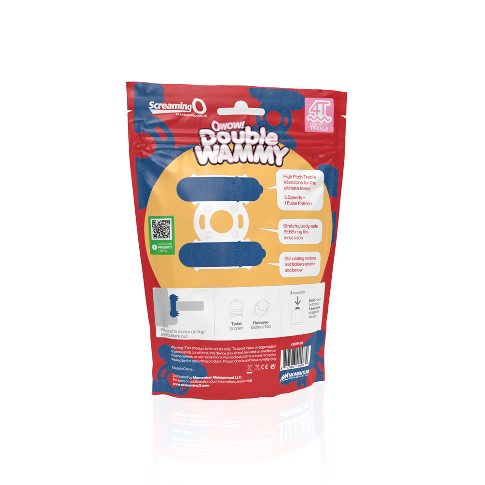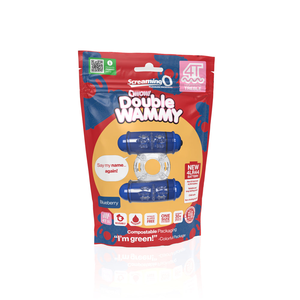 The treble style, tickle and tease 4T Double Wammy vibrating ring doubles couples fun with two separate motors uniquely styled for intense stimulation for both partners. Made of lab-tested body-safe SEBS, the stretchy, comfortable band and dual-action wammy effect offer unmatched stimulation for his and her pleasure.The 4T Double Wammy is packaged using materials that are ethical, sustainable, and eco-friendly. Additionally, is it utilizing new 4LR44 batteries that are child-safe, more reliable, and longer lasting. Screaming O believes in leaving this planet better off than we found it, which is why promoting positive sexual as well as environmental health is important to us.Features: Two 4T motors with treble style, tickle and tease vibrations 5 speeds plus 1 pulse pattern Lab-tested, 100% body-safe clear SEBS ring 100% Waterproof 30+ minutes of battery life New reliable and long-lasting 4LR44 battery
