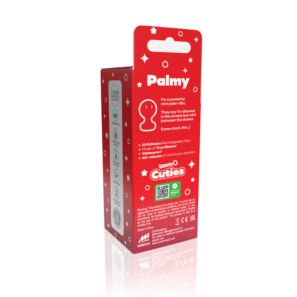 Say hello to Palmy, the newest addition to our Screaming O Cuties line. Designed for spontaneous pleasure and ultimate convenience, Palmy is a compact palm vibe that fits perfectly in your hand. This mini palm massager boasts 10 distinct functions, providing a wide range of vibration patterns and intensities to cater to your unique desires.Crafted from premium True Silicone, Palmy ensures a safe and luxurious experience every time. Its fully waterproof design means you can take it into the shower or bath for added excitement. With up to 40+ minutes of runtime on a single charge, Palmy is always ready to deliver powerful pleasure whenever you need it.Available in a chic Powder Blue color, Palmy combines style and functionality, making it the perfect grab-n-go item for your intimate moments. Whether you''re at home or on the move, Palmy''s discreet and compact design makes it easy to slip into your bag or pocket.Elevate your pleasure with Palmy, the compact palm vibe that offers a blend of convenience, power, and elegance. Discover the ultimate in portable pleasure with Screaming O Cuties'' Palmy. Perfect for those who want a reliable and stylish companion for their intimate adventures. Rechargeable mini palm vibe 10 vibration functions 40+ minutes of vibration Made of lab-tested body-safe True Silicone and ABS Waterproof