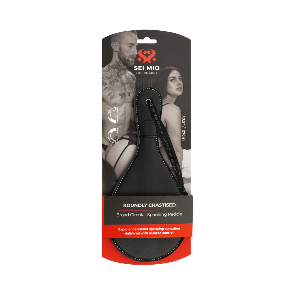 Take sensation play to new depths with the Sei Mio Roundly Chastised Spanking Paddle, designed with an expansive circular surface to deliver maximum impact. Wider than traditional paddles, this broad beauty ensures each swing reaches every inch of your partner''s posterior, spreading sensation for a satisfyingly deep, full-bodied response.Crafted for both impact and control, the Roundly Chastised Paddle lets you adjust intensity effortlessly, making it ideal for everything from gentle taps to more thrilling strokes. Its comfortable grip and striking design promise a powerful blend of pleasure and playfulness in every session. Wrist loop for increased control Broad Round paddle for spanking sensation play Easy to clean faux leather