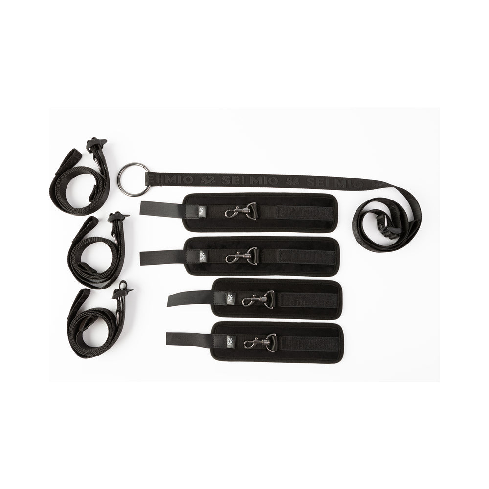 Turn your bed into the ultimate playground with the Sei Mio Bed-Spreader, a fully adjustable 4-way restraint system designed for limitless pleasure and exploration. Slip the straps under any mattress and fasten the wrist and ankle cuffs to keep your partner securely bound.With adjustable straps, you can tighten or loosen as desired, ensuring a snug fit that lets you control every inch of movement. Perfect for adding a spark of adventure to your play, the Bed-Spreader invites you to tease, please, and explore new thrills – all from the comfort of your bedroom. Easy to fit and discreet to store Adjustable straps fit all bed sizes (Single, Double, King, Super King) Quick and easy release velcro fastening Padded cuffs for comfort Removable cuffs offer flexibility in use Bonus positions with central carabiner design and removable straps