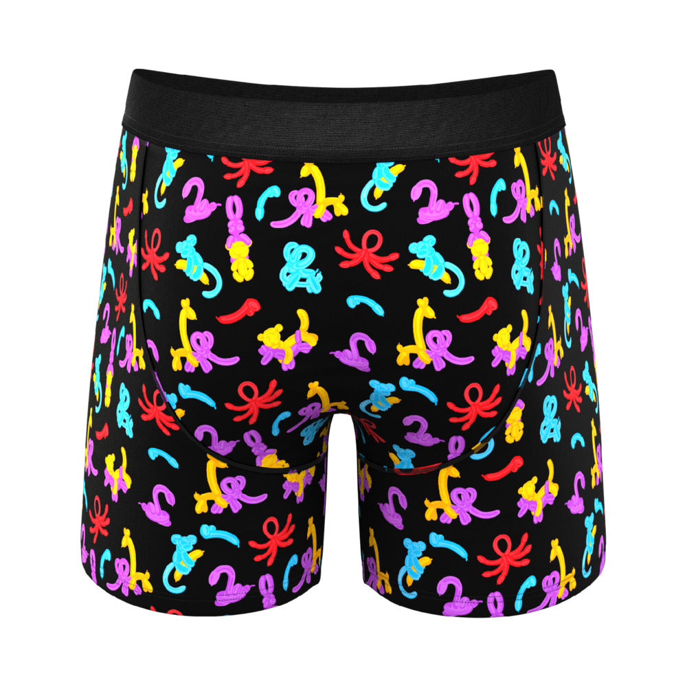 Here you have it, our greatest masterpiece, our Sistine chapel ceiling, our Mona Lisa: a pair of Ball Hammock boxers featuring carney balloon animals making whoopie. The world doesn''t deserve art like this, but to keep something this beautiful to ourselves would represent a crime greater than sin itself.Ball Hammock Pouch Underwear — Your Balls Will Thank You Supportive and enhancing pouch keeps the goods off your legs and out of the grundle Moisture wicking and breathable so you stay fresh, all damn day Soft. Like sooo soft. Like, softer than a baby chinchilla soft. Anti-bunching, no-itch stitching, 4-way stretch. Softest Fabric Around — Luxury 95% MicroModal, 5% Spandex is moisture wicking and breathable.All Modal is not equal. Our proprietary knitting process gives you a more sumptuous Modal per square inch for a softer, better fitting, and more durable product than the competition.How it Fits — Perfectly, with an even and lightly compressive fit through the legs to prevent ride up, plus extra space and support for the twins. If you''re between sizes or want more support, we recommend sizing down.