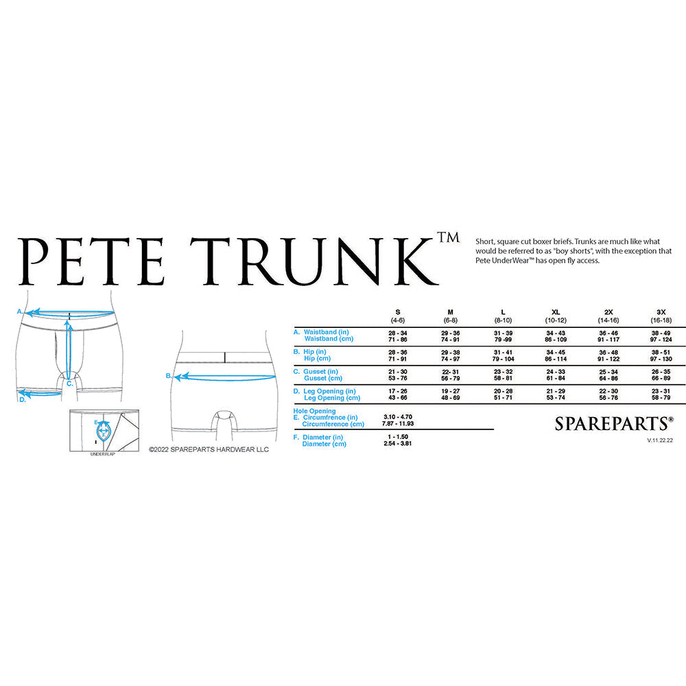 Pack like a Pro, with the UnderWear thatft.s got your back, your front and everything in between. Pete Trunks are short, square cut boxer briefs. Trunks are much like what would be referred to as in.boy shortsin. with the exception that Pete UnderWear has open fly access.Have your freedom and control all in one: Created exclusively for soft packing Works with a wide variety of packer brands, sizes and shapes Option to have the back of the packer directly against skin for full contact or to cover it Secure fit, allows you to move more freely, with zero fear that the packer will shift, dislodge, or fall out Open fly front design, great for easy access Use STP packers naturally with complete confidence Additional elastic strap sewn inside pouch for extra security Hand or machine washable, Pete is fully hygienic and perfect for everyday use Made with solid black, soft and sturdy elastic waistbands, tag-less labels, and have a smooth look under clothes Light weight, breathable Nylon Spandex fabric pulls moisture away from your body, keeping you cool, dry and comfortable all day, while the Jersey components in the fabric helps to hug and hold, and is comfy soft against the skin. 88% Nylon, 12% Spandex Waistband 31 - 39in. Hip 31 - 41in. Gusset 23 - 32in. Leg Opening 20 - 28in. Hole opening circumference 3.1 - 4.7in. Hole opening diameter 1 - 1.5in. Restricted from 3rd party website selling.