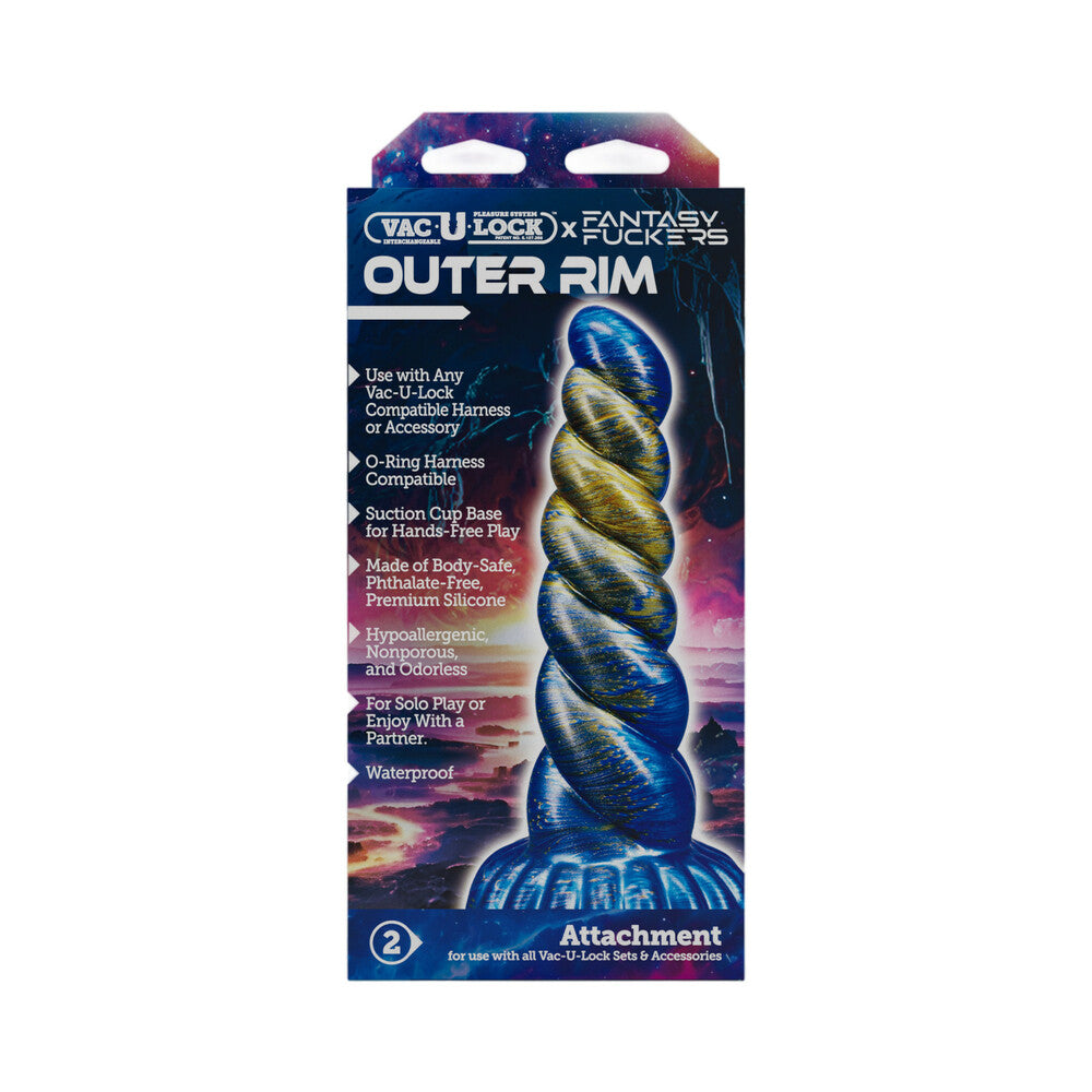 Embark on a erotic journey of pleasure with the Outer Rim, a silicone delight that will take you into the next galaxy of pleasure. This captivating toy features a perfectly rounded insertion point, with thrilling ridges, inviting you to explore new depths of ecstasy. The vertical shaft teases with every movement, offering a rhythmic sensation that enchants and enthralls. Swirling in vibrant blues marbled with shimmering gold, the Outer Rim is a visual feast as mesmerizing as its touch. Surrender to the surreal, seductive magic of this fantastical creation and let your desires wander through a the Outer Rim of bliss. Use with any Vac U Lock Compatible Harness or Accessory O-Ring Harness Compatible Suction Cup Base for Hands-Free Play Made of body-safe, Phthalate-Free, Premium Silicone Hypoallergenic, Nonporous, and Odorless For Solo Play or Enjoy With A Partner Waterproof Total Length: 8.5 in. (21.6cm)Insertable Length: 7.25 in. (18.4cm)Width/Diameter: 2.25 in. (5.7cm)Circumference: 7 in. (17.8cm)