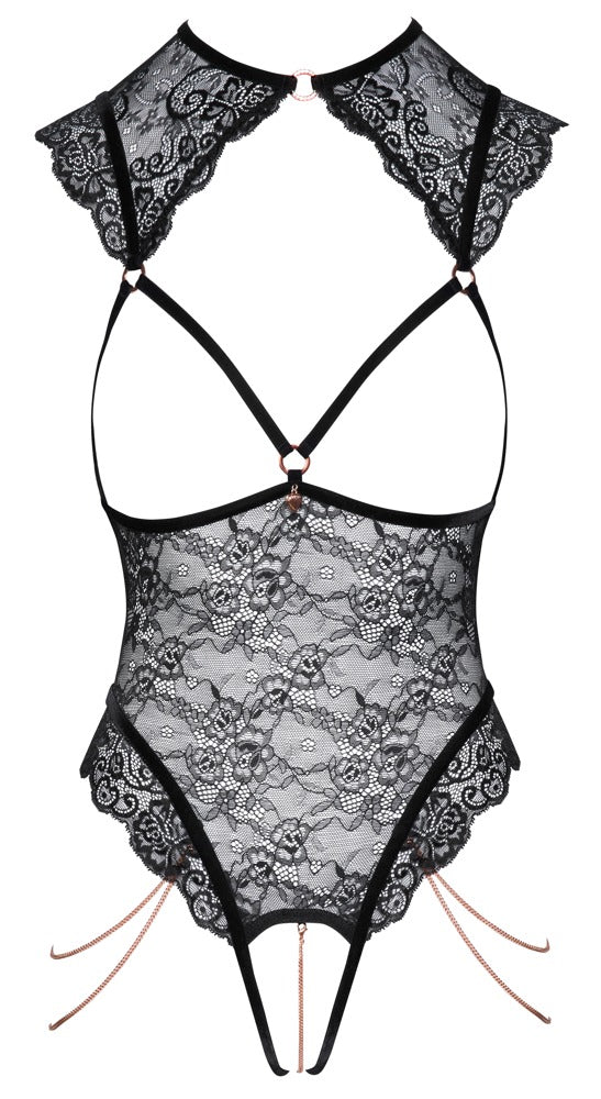 Sensual sophistication! The crotchless, black body from Abierta Fina is made out of soft & stretchy floral lace. The stretchy velvet straps and rose gold-coloured accessories emphasise the elegant, revealing look. It has seductive open cups and lace covering the shoulders. There is a sparkly rhinestone ring at the front of the neck and a small hook fastener at the back of the neck. There is also a beautiful heart-shaped pendant between the open cups. The open cups are framed by stretchy straps. There are 2 detachable thigh chains on the leg holes. The leg holes are in a high-leg design. The stimulating chain over the open crotch is also detachable. The bra straps and the 3 stretchy velvet straps at the back can be adjusted to fit. 90% polyamide, 10% spandex.