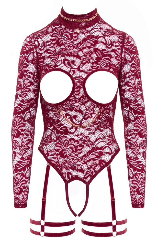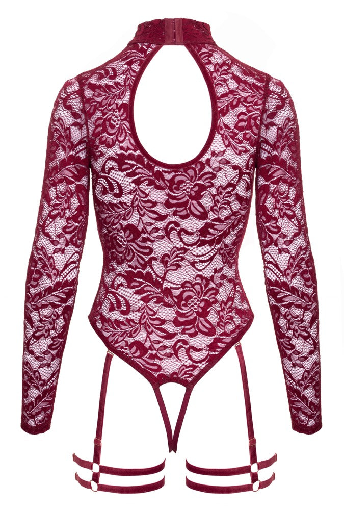 The art of lacy seduction! The long-sleeved burgundy red body from Abierta Fina comes with suspender harnesses. It is made out of soft stretchy floral lace with seductive velvet details and decorative rose gold-coloured chains. It is soft and stretchy for a very comfortable fit. It is in a revealing style with cut-outs over the breasts and an inviting open crotch area. The lace body also stands out because of its beautiful round cut-out at the back. There is a chain, with a heart-shaped pendant, at the front of the stand-up collar. The chain is removable – just like the snap hook chain attached to the rings underneath the breasts. The stand-up collar has a hook fastener. The adjustable suspender and thigh straps can also be removed from the lace body. 90% polyamide, 10% spandex.