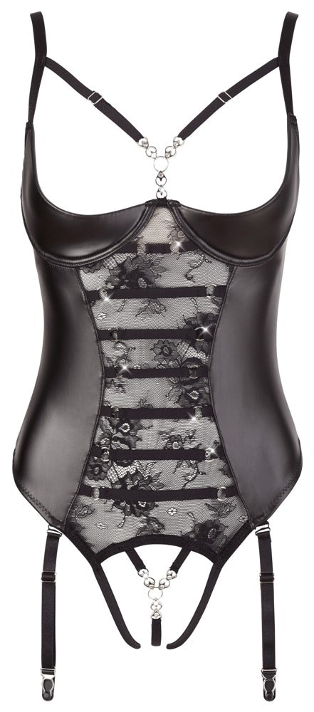 Beautiful design with ingenious insights! Sensual string body with adjustable and detachable suspender straps and a slightly padded shelf bra with hook fastener at the back. With delicate strap details and elaborate rhinestones in the cleavage area. The semi-transparent lace inserts at the front allow lascivious insights. Above that, there are additional refined lacings with silver rings and stretchy straps. The crotch is completely open and features exciting strap details and rhinestones as well. 90% polyester, 10% spandex; lace 90% polyamide, 10% spandex.