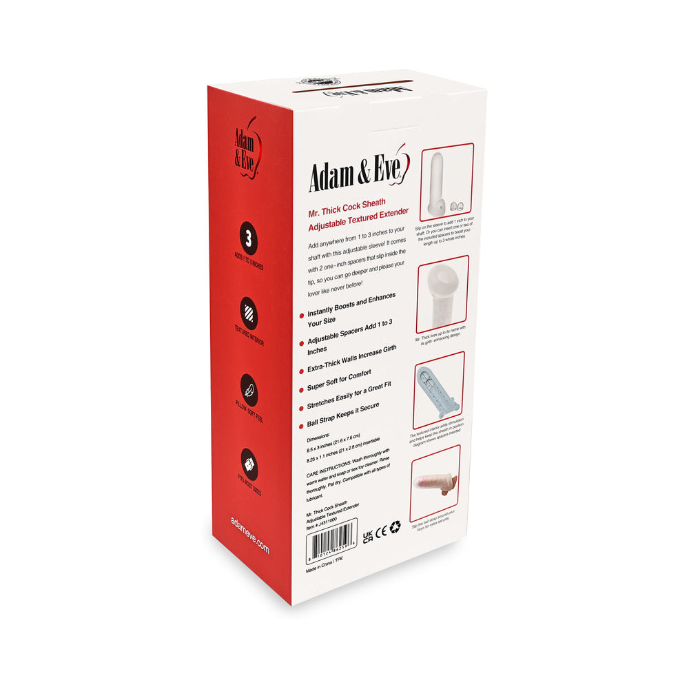 Add 1-3 Inches To Your Length With Adjustable Penis Sleeve!Bulk up your rod with the Mr. Thick Sheath from Adam & Eve! This girthy sheath is the ultimate enhancer since you can customize it based on your needs. The sleeve itself adds 1 inch to your length, and it comes with 2 removable spacers that fit inside the tip. Each spacer adds 1 more inch to your length. If you use them both, that adds an extra 3 inches to your shaft for super-deep thrusts! The sleeve''s extra-thick padding greatly increases your girth as well, so you can fill up your partner and leave them fully satisfied. Its textured interior adds stimulation during playtime. A ball strap helps you last longer and keeps the extension securely in place. Measures 8.5 by 3 inches total; interior is 8.25 by 1.1 inches. Made from TPE. Boost your length and girth to drive your lover wild Sleeve instantly increases your length by 1 inch Add up to 2 more inches with 2 optional spacers Extra-thick 3-inch sleeve fills and satisfies your lover Textured interior increases your stimulation Ball strap boosts endurance and holds the sleeve in place 8.5 by 3 inches total; interior is 8.25 by 1.1 inches Made from soft and stretchy TPE Works best with water-based lubes