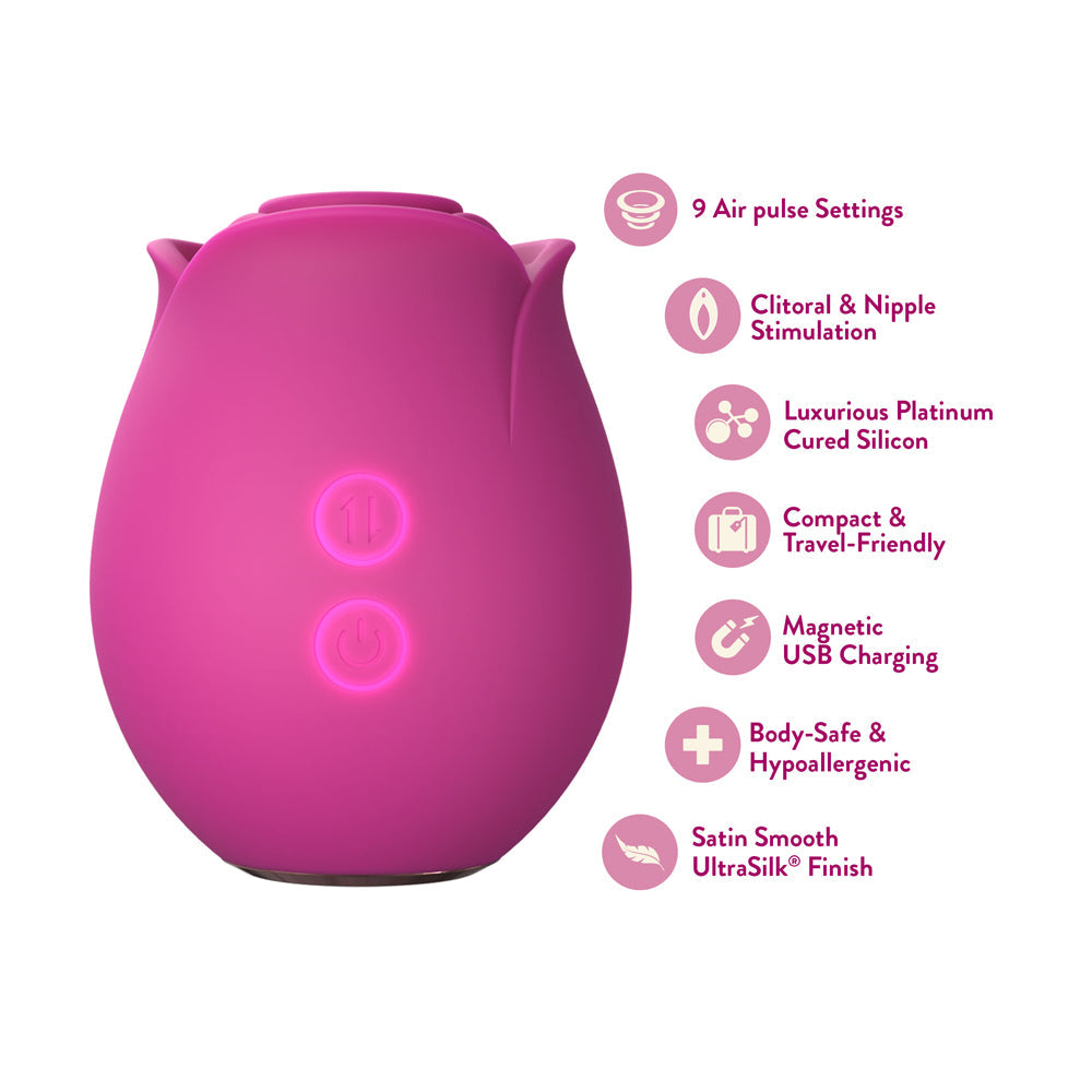 Experience the elegance and luxury of The Original Blush Rose to elevate your intimate play. Fitting comfortably in the palm of your hand, this rose-inspired massager features powerful Air Wave suction technology, offering a delightful array of 9 settings, with 6 speeds, and 3 unique patterns for soft, sensual stimulation from its petal-shaped tips. Crafted from 100% body-safe platinum-cured silicone with an UltraSilk satin-smooth finish, The Rose is not only stunning to behold but also a pleasure to touch. Its compact, travel-friendly design, paired with magnetic USB charging, ensures it''s always ready to fulfill your desires. Perfect for both solo and partnered use, The Rose is easy to clean, non-porous, and splashproof, inviting you to explore freely. Unveil your passionate desires and bring elegance and delight to every intimate experience. 9 Air Wave Sensations, 6 Speeds and 3 Patterns Perfect For Clitoral and Nipple Stimulation 100% Body-safe Platinum Cured Silicone UltraSilk Satin Smooth Finish and Feel Splashproof and Magnetic Rechargeable