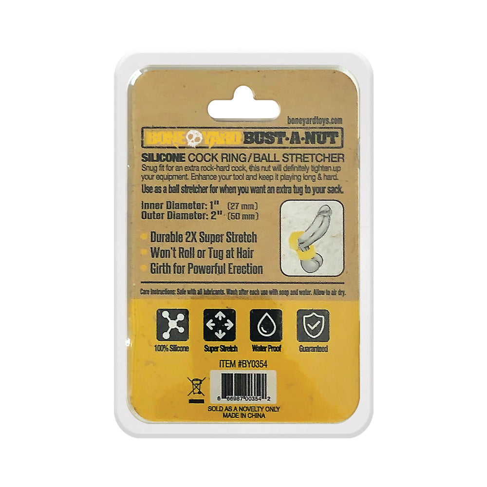 Bust a Nut has a sleek and soft touch silicone finish and features a superior and durable 3X stretch. The Bust a Nut can be worn as a traditional cock ring or ball stretcher and can be used for nut stacking to give that perfect tug and slap on the ass while pounding away.The rings provide all day comfort when wearing under your jeans or swimsuit to show off that perfect man bulge. They will also withstand the punishment of your longest play sessions time and time again.This product is safe with all lubricants, completely hypoallergenic, non-irritating and compatible with sensitive skin. Thick Girth for A Powerful Erection No Roll Comfort Fit 100% Soft Touch Silicone 3 X Stretch External Diameter: 2.0" (50mm) Internal Diameter: 1.07" (27mm) Package Dimensions: 5.25" x 4" x .75" Weight: 0.2 lbs.