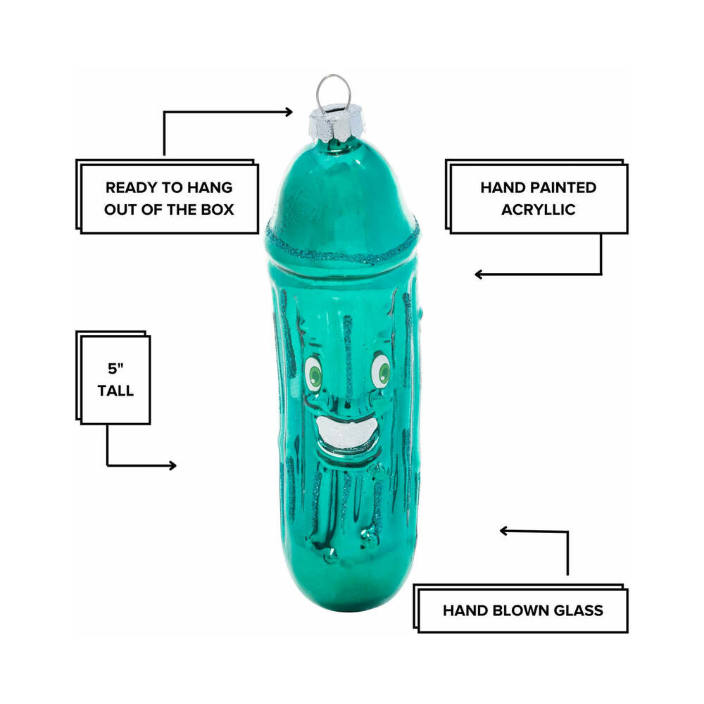 This is a pickle that looks like a dick. Some would call it dickle. Some may not even notice that suspect tip. Call it an incogpeen-o ornament. Think you can slip it past grandma? Each Ornament is hand blown by a glassblower Each is individually painted and goes through a ten point quality control test Depending on the ornament, standing height will be between 5 - 7 in. tall and under one pound Packaged Individually in a two-piece protective shell
