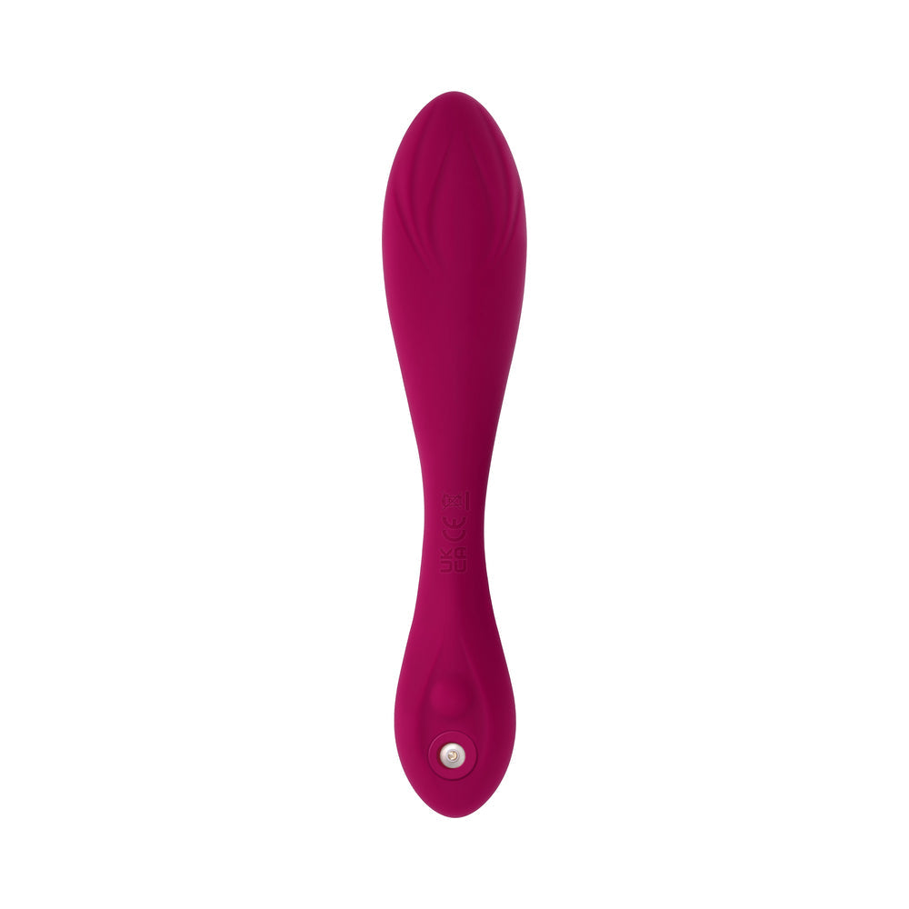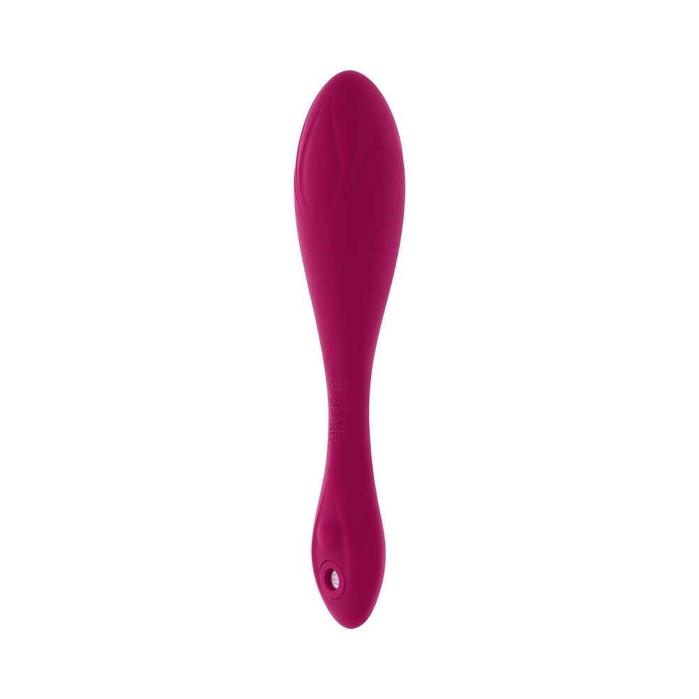 Strike a cherry pose with this flexible, poseable vibrator that stays just how you bend it. Powerful vibrations emanate from each textured head simultaneously to bring you double the pleasure no matter what curve you choose. One end swells to a bulbous girth with a tapered tip while the smaller end is oval shaped with a center bulge. Share your experience or make it hands-free with the 30'' range remote control. 10 vibrating speeds & patterns 2 motors, operated together Insertable length: 5", diameter: 1.25" Made from phthalate & latex free Silicone USB magnetic rechargeable toy & remote, cable included Height: 6.34", Depth: 0.71", Width: 1.25" Remote: Height: 2.2", Depth: 0.77", Width: 1.35", Range: 30'' Waterproof