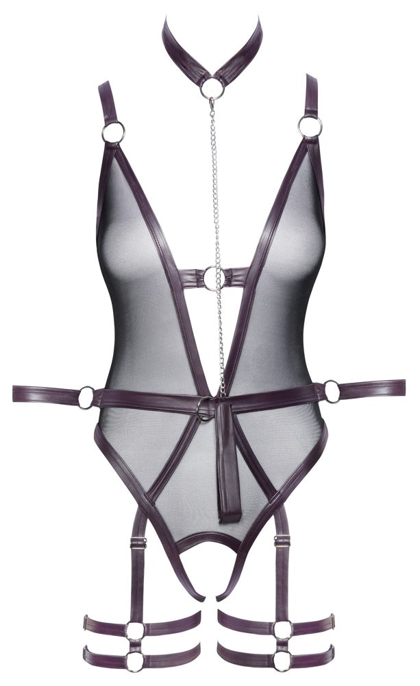 Body with captivating extras! The crotchless body from Cottelli BONDAGE has removable suspender straps and thigh harnesses. A collar with chain leash and two arm restraints for soft bondage games are also included! The body is made out of black powernet and it has decorative details in dark purple matte look material. It also has silver-colored accessories. It is low-cut at the front and the back. It is seductively crotchless too. With a hook fastener at the back and adjustable straps. The waistband has rings on it for the two included arm restraints. The restraints can be put on quickly, thanks to their hook and loop fasteners, and they can also be adjusted to fit. This is also like the included choker with the removable chain (with a snap hook) that can be used as a leash. The adjustable suspender straps and double thigh straps can be removed as well. 90% polyamide, 10% spandex.