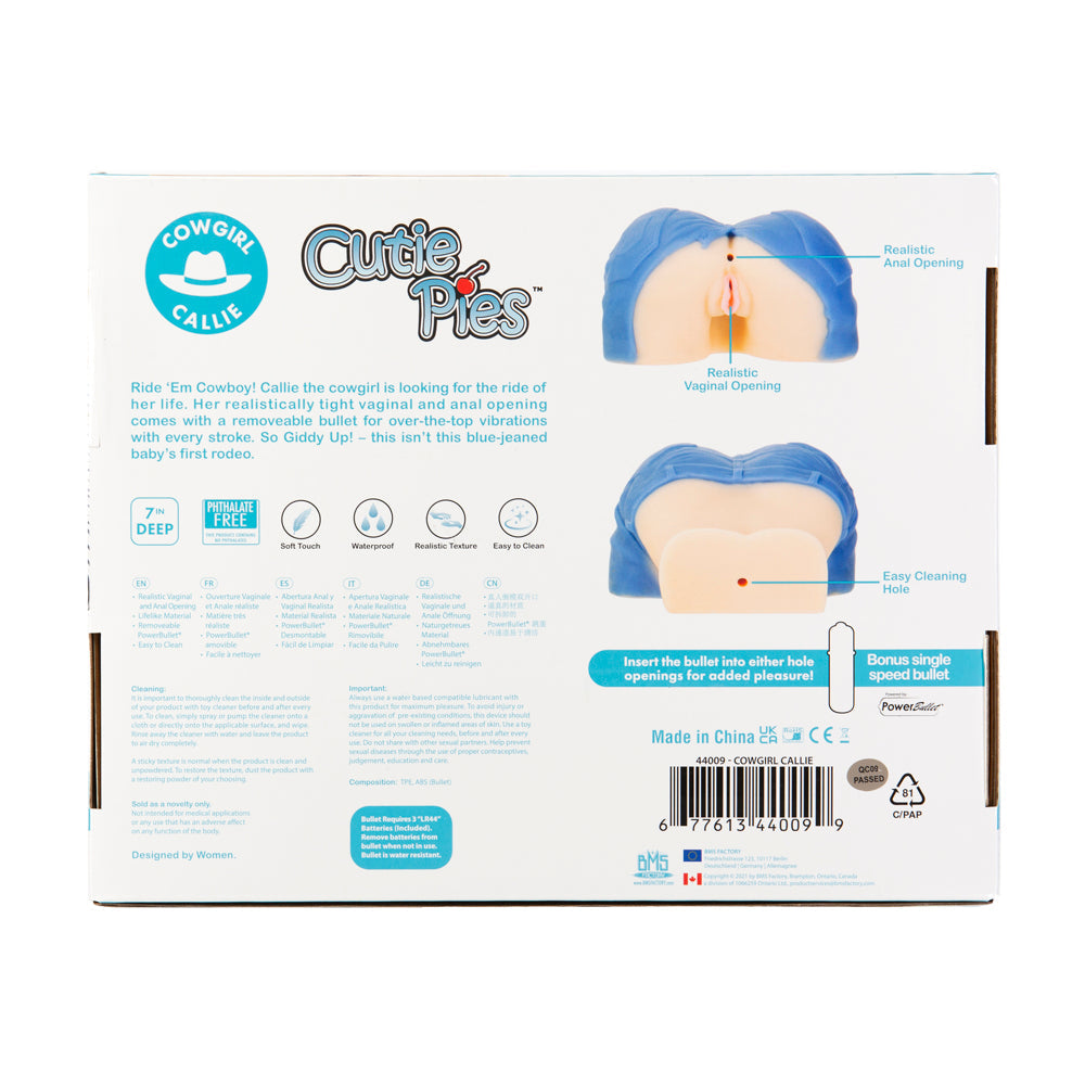 Meet the CutiePies: a collection of lifelike masturbators all with their own passionate personas. These ladies are made with ultra-soft TPE material and are all equipped with realistic openings for endless stroking. Easy to clean, perfectly sized and better than real, youll fall in love with CutiePies! Ride Em Cowboy! Its time to save a horse and ride a cowgirl! Her tight vaginal and anal openings are 7 inches deep, uniquely textured and open ended for easy cleaning. An added hole perfectly fits the included removeable bullet for over-the-top vibrations with every stroke. Made from soft and supple TPE material that is 100% body safe and provides the upmost lifelike experience, once this cowgirl is done with you, youll be wondering whether or not shes the real deal! Callie is nearly 5 pounds of pure pleasure, with a huge ass and sexy cut-off shorts to match. So, Giddy Up! This isnt this blue-jeaned babys first rodeo. Key Features: Masturbator Tight Vaginal & Anal Openings 7in. Deep Removeable Vibrating Bullet Textured for Added Stimulation Soft & Supple TPE Material Compact Easy to Clean