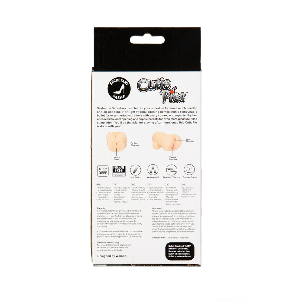 Meet the CutiePies: a collection of lifelike masturbators all with their own passionate personas. These ladies are made with ultra-soft TPE material and are all equipped with realistic openings for endless stroking. Easy to clean, perfectly sized and better than real, youll fall in love with CutiePies! Sasha the Secretary has cleared her schedule for some much needed one-on-one time. Are you ready to show her whos boss? Her tight vaginal and anal openings are 6.5 inches deep, uniquely textured and open-ended for easy cleaning. An added hole perfectly fits the included removeable bullet for over-the-top vibrations with every stroke. Made from soft and supple TPE material that is 100% body safe and provides the upmost lifelike experience, once this secretary is done with you, youll be wondering whether or not shes the real deal! Sashas compact size makes her easy to bring with you anywhere, for stroking around the clock! Youll be thankful for staying after hours once this CutiePie is done with you! Key Features: Masturbator Tight Vaginal & Anal Openings 5in. Deep Removeable Vibrating Bullet Lifelike Breasts Textured for Added Stimulation Soft & Supple TPE Material Compact Easy to Clean