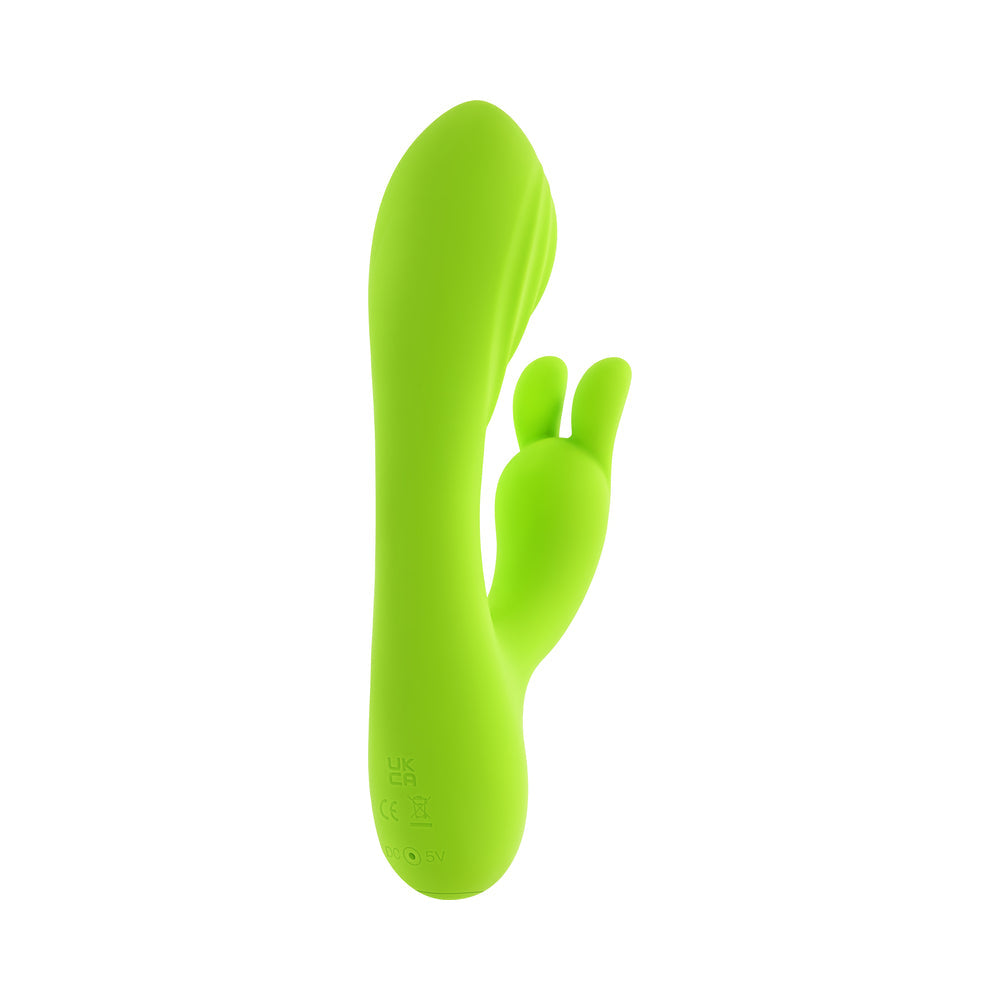 Get nightclub play-time vibes with Brat Bunny, the electric green rabbit vibrator that delivers a steady beat of pure pleasure. Two powerful motors – one in the textured chubby G-spot head and one in the bunny-ear stimulator – work together in unison for a dual experience that''s as gentle or crazy-intense as you desire. Choose the rhythm you want as the toy follows your movements with its flexible, floppy shaft. 10 vibrating speeds & patterns Insertable length: 4", Insertable diameter: 1.47" Made from phthalate & latex free silicone USB rechargeable, cable included Height: 6.38", Depth: 2.65", Width: 1.47" Waterproof