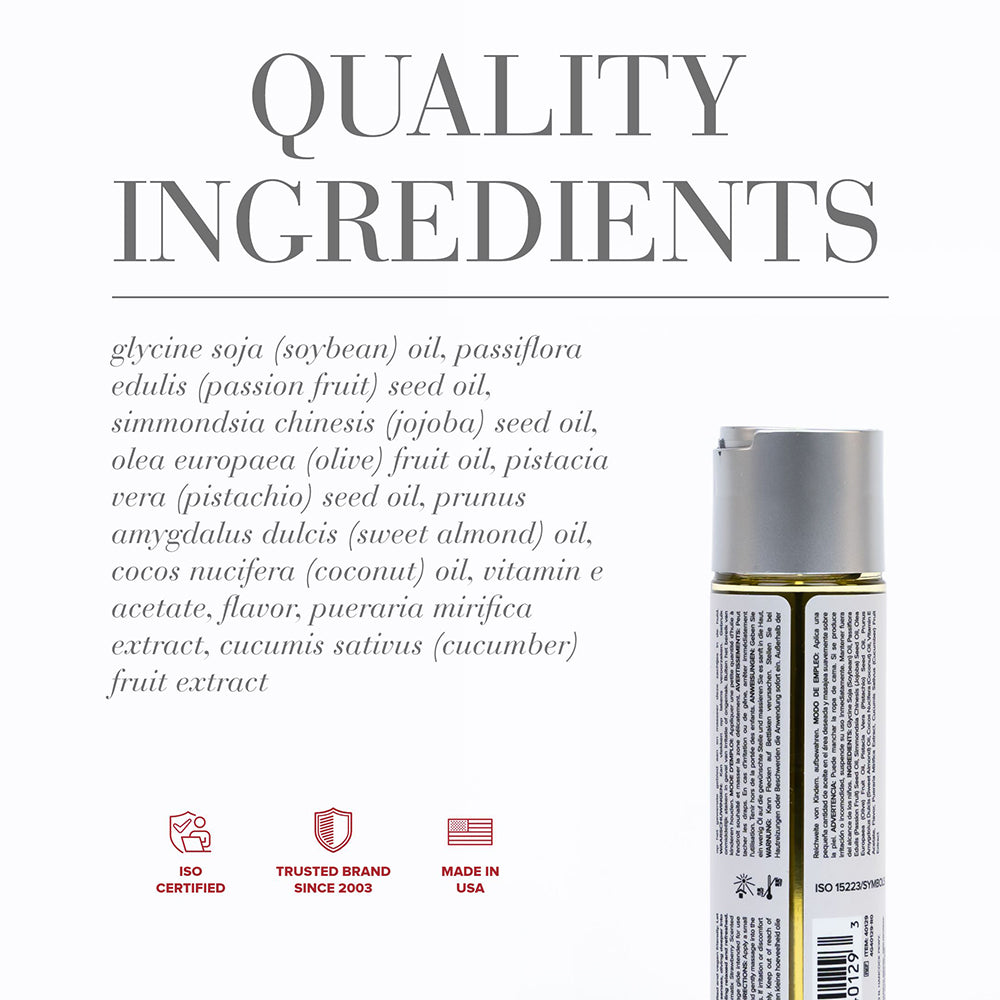 JO Aromatix Strawberry Massage Oilft.s unique blend of ingredients can transform any intimate moment into a captivatingly sensual experience. Featuring a combination of skin-nourishing oils and alluring fragrance of juicy, ripe strawberries, Aromatix enhances every touch with a rich, moisturizing glide thatft.s always pleasing - but never greasy. All Aromatix formulas are kissable, elasticity enhancing, and vegan friendly. Skin-Nourishing, Scented Oils Ripe Strawberry Fragrance Kissable, Vegan Friendly Formula Skin Elasticity Enhancing Moisturizing Glide Never Greasy Made in the USA ISO Certified 100% Pleasure Guarantee Ingredients: Carthamus Tinctorius (Safflower) Seed Oil, Passiflora Edulis (Passion Fruit) Seed Oil, Pistacia Vera (Pistachio) Seed Oil, Olea Europaea (Olive) Fruit Oil, Pueraria Mirifica Exteact, Cucumis Sativus (Cucumber) Fruit, Cocos Nucifera (Coconut) Oil, Simmondsia Chinesis (Jojoba) Seed Oil, Prunus Amygdolus Dulcis (Sweet Almond) Oil, Vitamin E Acetate, Flavor