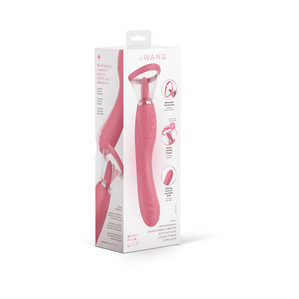 The Le Wand Lick is a 3-in-1 rechargeable double-ended vibrator featuring a sleek handle that serves as a gentle G-spot massager, while the other end includes a silicone tongue with a removable suction cup for tantalizing oral stimulation. This thoughtfully designed triple-function sex toy mimics the sensation of a human tongue for ultimate pleasure.all-in-one oral & g-spot stimulation — The Le Wand Lick features a sleek handle that serves as a gentle G-spot massager, while the other end includes a silicone tongue with a removable suction cup for tantalizing oral stimulation.Craving the thrill of oral but with a twist? Whether you''re looking to replace, upgrade, or double the fun, the Le Wand Lick serves up deep, rumbly sensations that mimic the real thing–only with way more stamina and zero complaints.double ended pleasure — Ergonomic, versatile, and perfect for solo or partnered play, the Le Wand Lick is a three-in-one sex toy for those who crave the sensuality of oral stimulation with the power and precision of a luxury G-spot vibrator.mindblowing stimulation — Engineered for clitoral stimulation and external pleasure, the Le Wand Lick offers a unique combination of rolling, flicking, and pulsing sensations to deliver an experience that feels just like–or even better than–oral sex.intense targeted pleasure — Whether used as a standalone pleasure tool or an enhancement to oral sex, this vibrator delivers consistent, orgasmic stimulation with no fatigue or interruptions. A Mouth that only says what the user wants to hear…mindblowing simulated oral sex with g-spot stimulation — Experience next-level pleasure with our advanced wand massager. It features a sleek handle that serves as a gentle G-spot massager, while the other end includes a silicone tongue with a removable suction cup for tantalizing oral stimulation. This thoughtfully designed triple function toy mimics the sensation of a human tongue for ultimate pleasure. Flicking Tongue for Pinpoint Clitoral Stimulation Powerful Suction Strength for Heightened Response and Sensitivity Mimics Oral Stimulation Curved Ergonomic Handle Doubles as an Insertable Vibrator Textured Shaft Provides Orgasmic Sensations to the G-Spot Removable Suction Cup for Convenience, Cleaning & Ease of Use Material: Body-Safe Silicone, ABS & PC Size: 59 (W) x 256 (H) x 81 (D) mm Weight: 261 g Battery: 500mAh Charging Time:120 minutes Use Time: 80~180 minutes Interface: 4 button control
