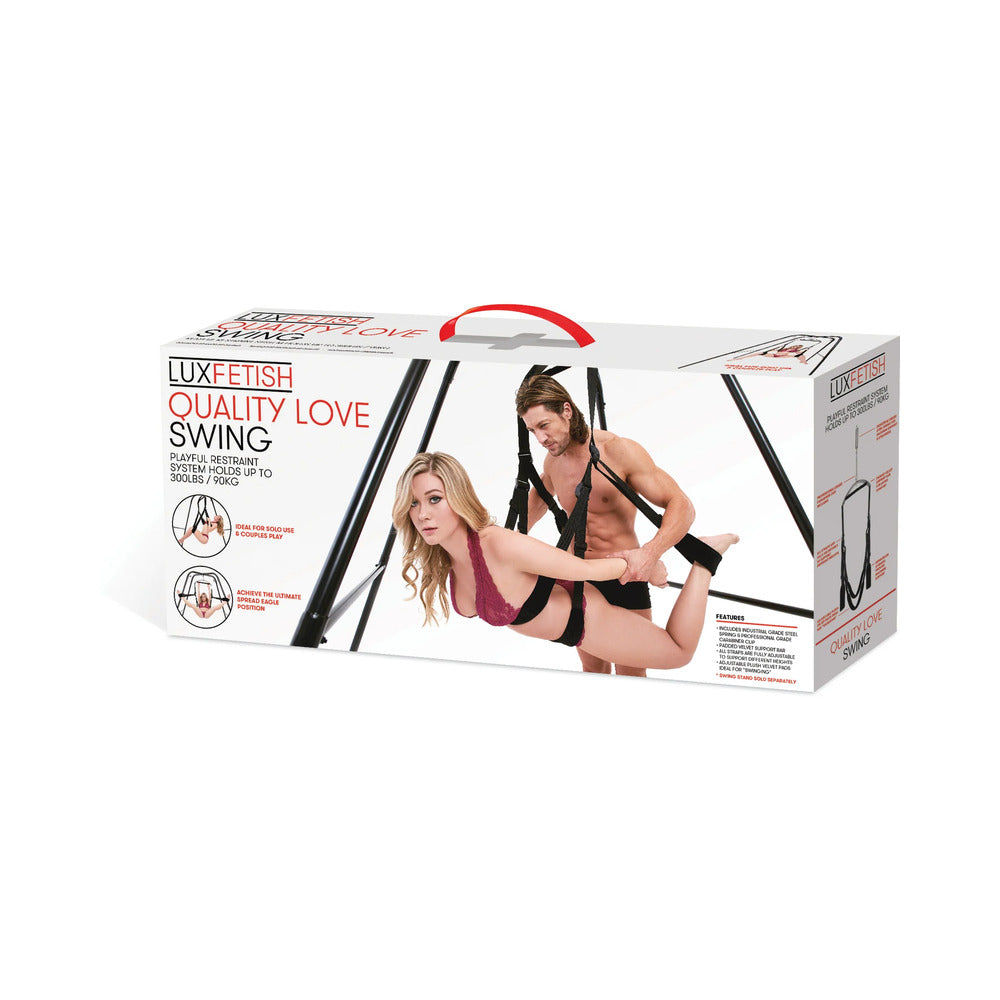 Lux Fetish Fantasy Swing (Black)Swing into action and discover angles you never thought possible with this versatile, thrilling sex apparatus from Lux Fetish. Turns any standard door into a sex swing in mere minutes. Fully adjustable with an industrial grade steel spring, and reinforced stirrups that provide maximum support. Make sure to carefully follow all printed instructions, and have fun!Steel Spring.