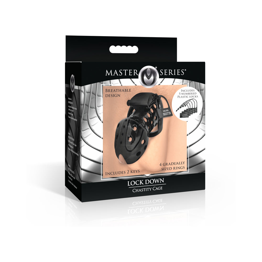 Explore new realms of submission and control with the Lock Down Chastity Cage. The cum-thru tip lets you maintain bathroom convenience, even during extended wear. Thanks to the breathable design, evenly spaced holes ensure your comfort by keeping everything ventilated. Customize your experience with four ring sizes, designed to give you the perfect fit around the base of your shaft. Enjoy secure confinement with two locking mechanisms: a pin and a key that only the Keyholder can operate. This comprehensive kit also includes an internal lock, 2 keys for additional peace of mind, a locking pin, and 5 keyholder tags that ensure that the Keyholder can tell if their naughty caged submissive breaks their chastity. Discover a new level of intimate play today!The cage slips onto a lubed, flaccid shaft. The pin is placed into the ring, the key locking it all in place. The Keyholder hangs the key around their neck. As you gaze up at them, you see the glint of the metal shining in the dim light, reminding you of their dominance over you. Suddenly, all you can think about is getting out of the cage, but you''ll do anything for them to get that privilege. They become your sole focus, pleasing them and making them think you are worthy of release. Cum-Thru Tip: Easily use the bathroom and relieve yourself with the open tip at the end of the cage''s shaft. Breathable Design: The breathable design includes holes spaced evenly across the cage to keep things dry and reduce discomfort during long-term wear. Four Ring Sizes: Includes 4 rings that gradually increase in size to enable you to find the most comfortable fit around the base of your shaft. Two Locking Mechanisms: A pin slides into place to hold the ring to the cage. Then a key locks the pin in place, and only the Keyholder can release you! Includes Chastity Accessories: Includes internal lock, 2 keys, locking pin, and 5 keyholder tags that help the Keyholder make sure that their caged partner doesn''t break out without them knowing! Materials: Plastic, metal Measurements:Cage is approximately 3 inches Length x 2 inches WidthRing inner diameters: 1.9 inches, 2.1 inches, 2.2 inches, 2.3 inches