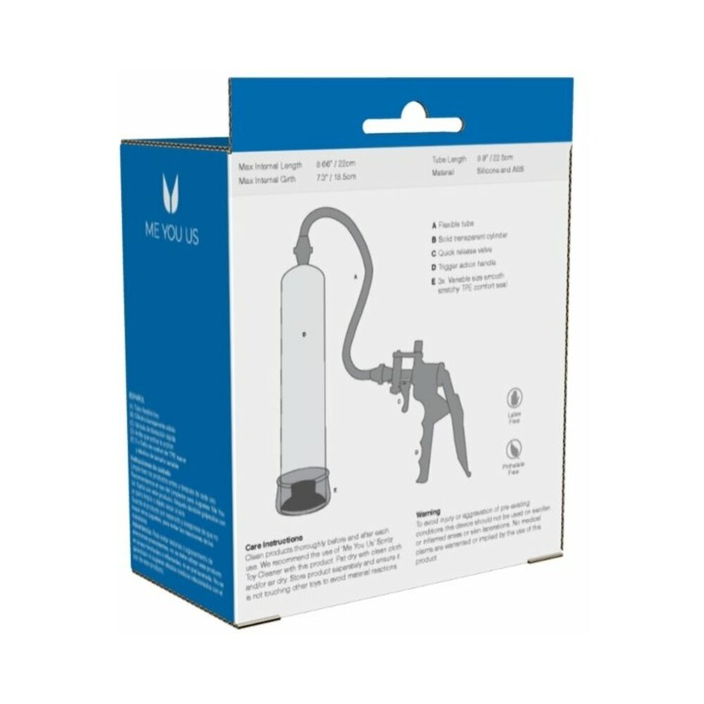 The Me You Us penis pump features a vacuum pump that works to enlarge your penis in length and girth. This penis pump also encourages healthy blood flow and keeps your penis in great shape.This pump comes with three sleeves, each a different size. This allows you to find your perfect fit. This penis pump is made from ABS plastic and the transparent design allows you to see the magic happen. This pump features a plastic shaft with a ruler as well as a pump with a pressure release trigger and pressure gauge.