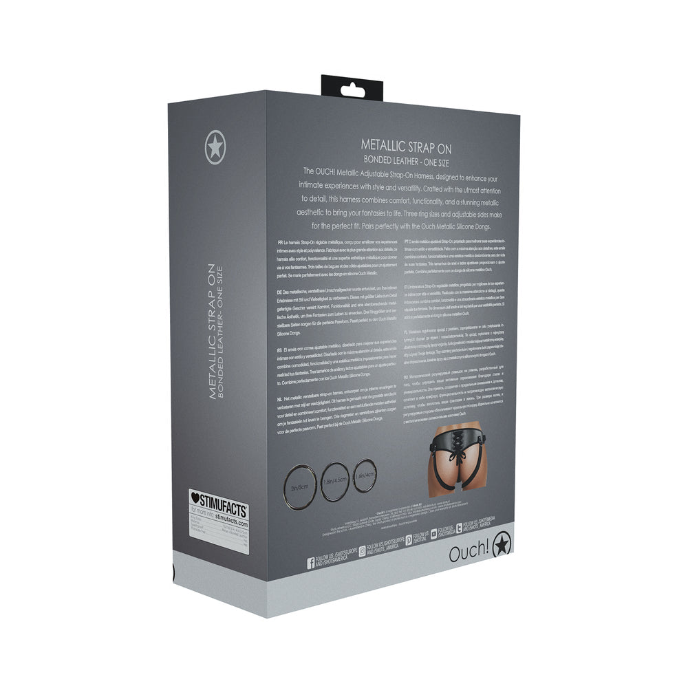 The OUCH! Metallic Adjustable Strap-On Harness, designed to enhance your intimate experiences with style and versatility. Crafted with the utmost attention to detail, this harness combines comfort, functionality, and a stunning metallic aesthetic to bring your fantasies to life. Three ring sizes and adjustable sides make for the perfect fit. Pairs perfectly with the Ouch Metallic Silicone Dongs. Splashproof: Yes Phthalate free: Yes Materials: PU, Metal rings
