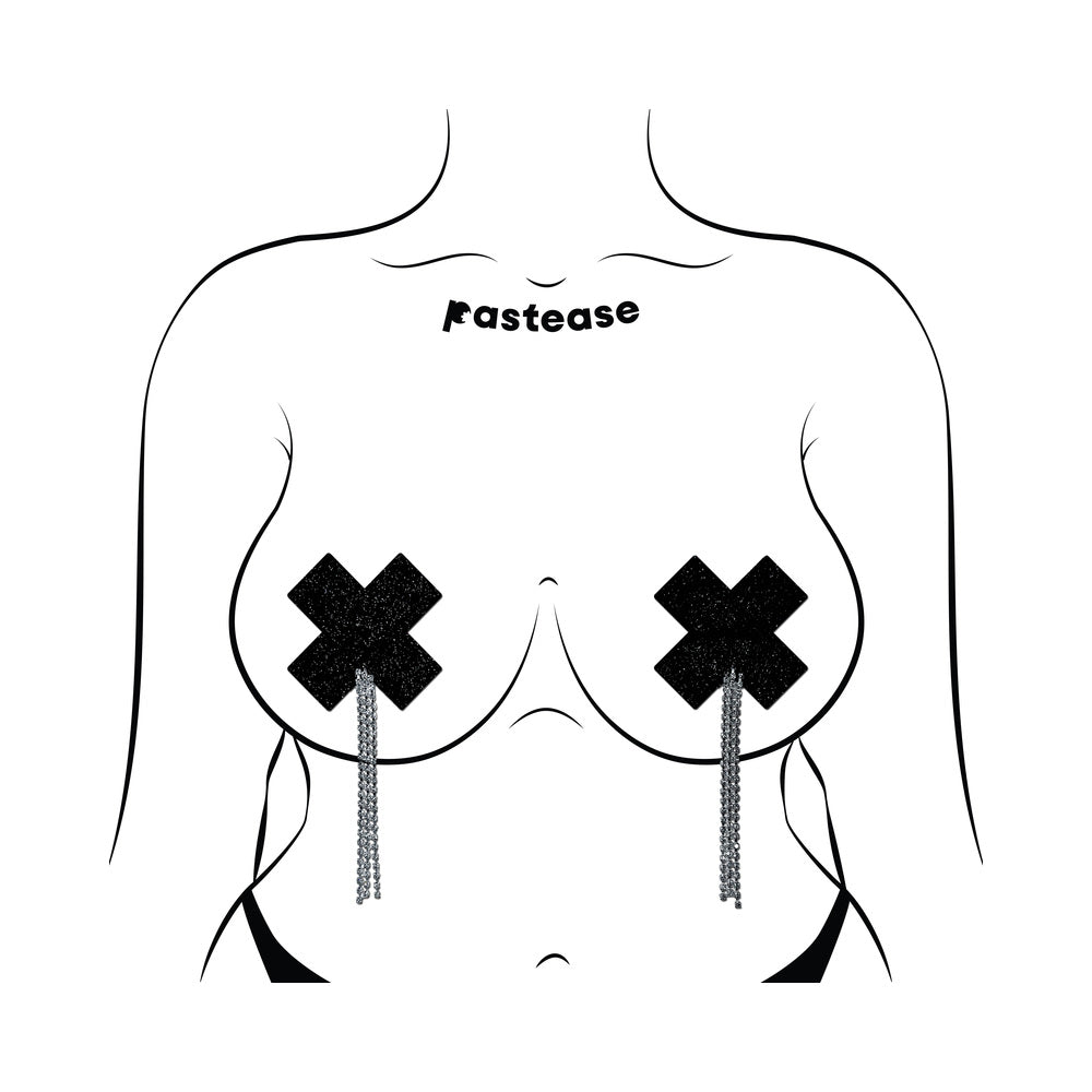 Introducing Tassel Pasties: Black Sparkle Plus X with Rhinestone Fringe by Pastease – Bold, Sexy, Unforgettable.Own the night with fierce confidence in our Black Sparkle Plus X Tassel Pasties! With a daring X-shape, sultry sparkle, and dramatic rhinestone fringe, these pasties are your ultimate secret weapon for date night or after-dark adventures.Striking X-Shaped Design — Command attention with this bold and edgy silhouette. The signature Plus X shape flatters your curves while making a seductive style statement that says, I came to slay.Black Sparkle Finish — A deep, glimmering black glitter surface adds a touch of mystery and allure–catching the light just enough to tease and tantalize without giving it all away.All Eyes on the Tassels — Each pastie is adorned with long, crystal rhinestone fringe that sways with your every move. Whether you''re dancing, strutting, or turning up the heat, the tassels bring hypnotic sparkle to your every step.Comfort Meets Allure — Crafted with skin-safe, medical-grade adhesive, these pasties stay put through every moment of excitement–offering both comfort and confidence that lasts.Perfect for Date Night, Lingerie Looks and After-Hours Play — Turn up the heat and add a little glam to your seduction game. These tassel pasties are made to elevate your look and leave a lasting impression.Set the tone, steal the scene–Black Sparkle Plus X Tassel Pasties by Pastease are here to make your night unforgettable.Dimensions: 3" x 3"Coverage: 1.6" Circular SAFE FOR SKIN — All PASTEASE adhesive products are latex-free and leave the skin with no signs of irritation upon removal. MEDICAL-GRADE — At PASTEASE, our products are hand-made, in house, with LOVE while using the highest-grade materials. WATERPROOF — Our PASTEASE brand pasties are waterproof and sweat resistant, keeping you worry free for any occasion.