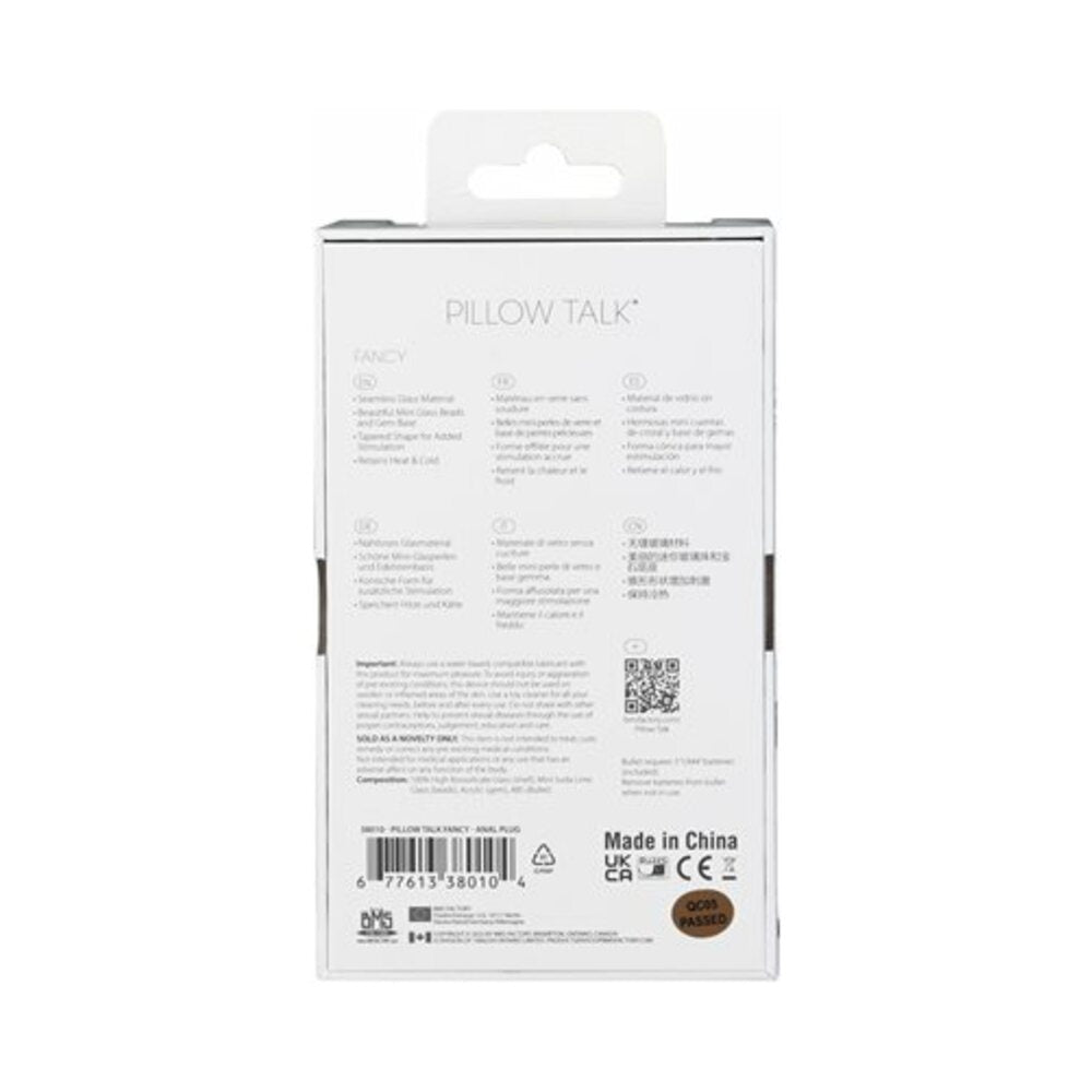 Experience ultimate elegance with Fancy. This shimmering glass anal toys interior is filled with sparkling mini glass beads and features an exquisitely sculpted gem base. Its tapered shape and glossy, smooth surface make insertion a breeze and the wide base allows Fancy to sit comfortably in place. Always enjoy with a silicone or water-based lube for the highest levels of comfort and pleasure. Crafted with borosilicate glass, this toy retains temperature, allowing you to easily experiment with both hot and cold for added sensations. Simply run it under hot or cold water to discover a new realm of pleasure. The sleek, seamless surface is easy to clean and ideal for those with sensitive skin. Always wash well with soap and water or a toy cleaner before and after every use. Get Fancy with Pillow Talk®! Key Features: Luxurious Body-Safe Glass Tapered Shape Designed for Easy Insertion Temperature Play Sculpted Gem Base Compatible with All Anal Lubricants Bonus PowerBullet® with 3 LR44 Batteries Included Easy to Clean Dimensions: Total Length: 4 in Insertable Length: 3.2 in Plug Diameter: 1.2 in